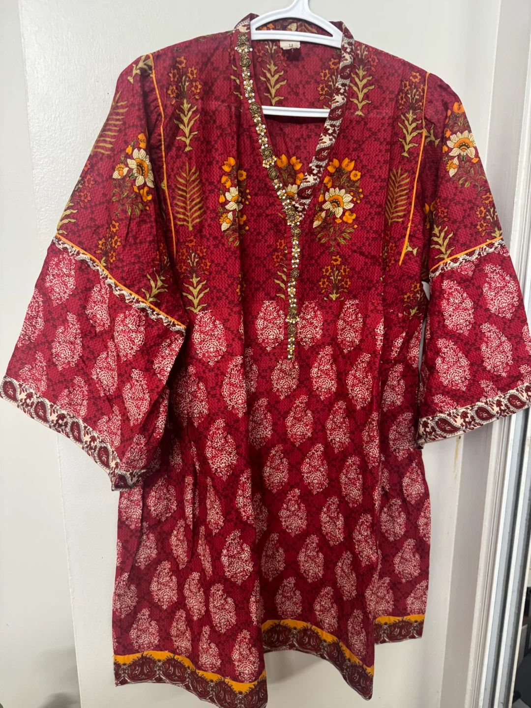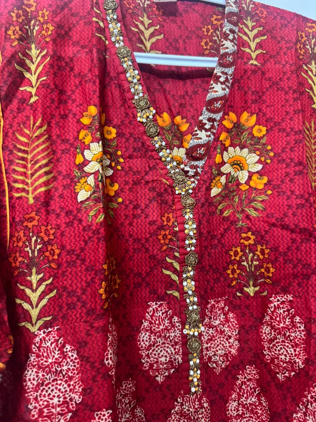 This women's kurti features a vibrant red base with a beautiful all-over floral print. It comes with a matching dupatta and off white shalwar, also adorned with a complementary print. The neckline is embellished with delicate beadwork for a touch of elegance. It's perfect for casual wear or festive occasions!