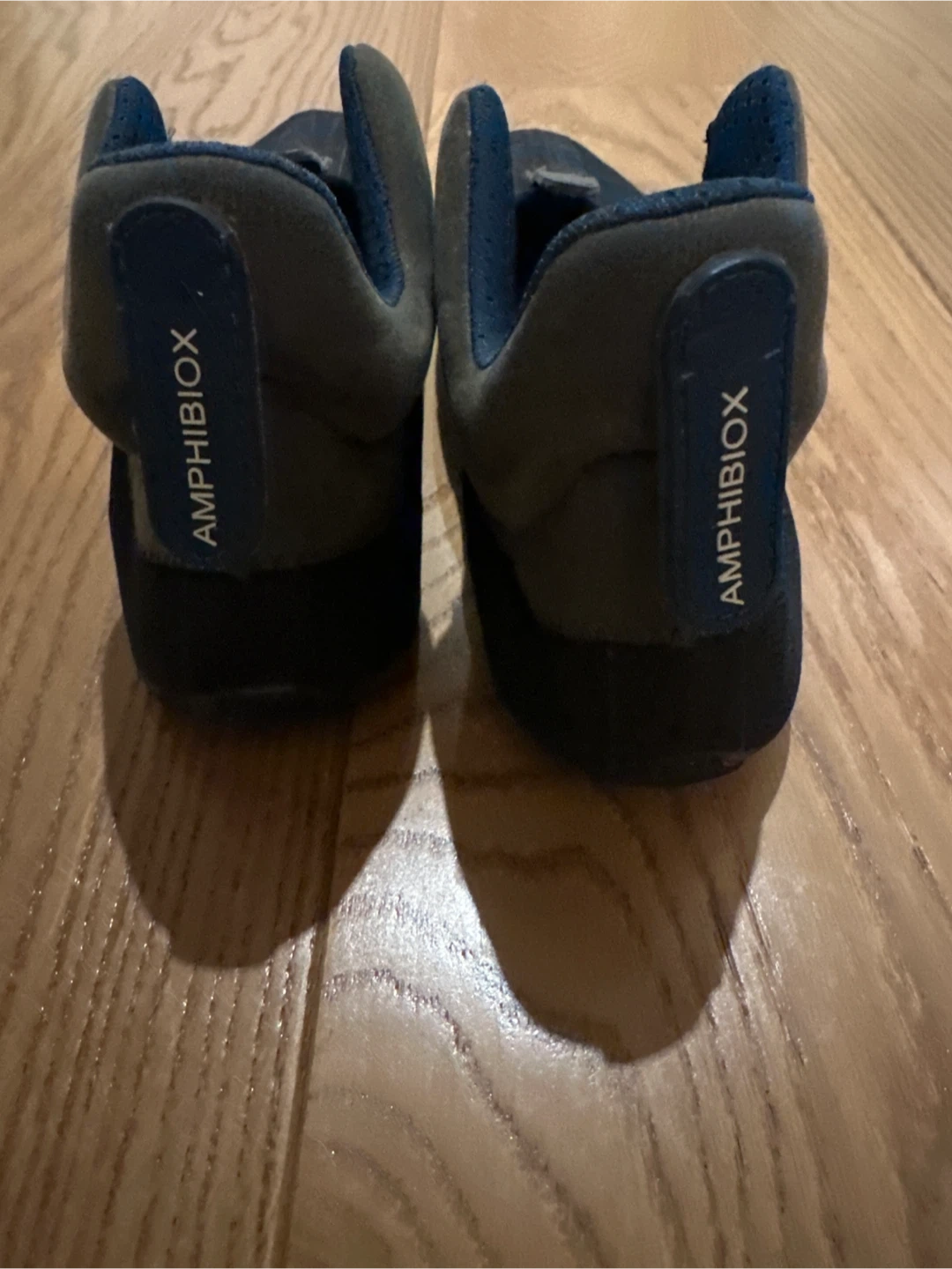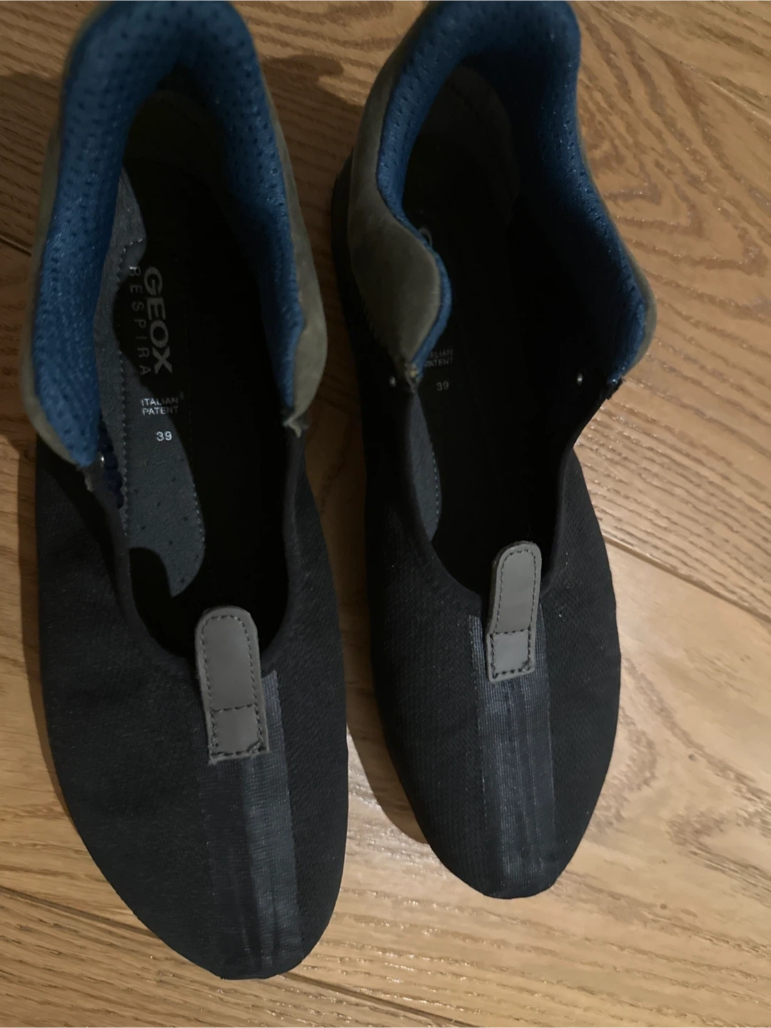These Geox Amphibiox shoes are black with blue accents and a size of 39. They're designed for breathability and water resistance. Great for casual wear or light outdoor activities.