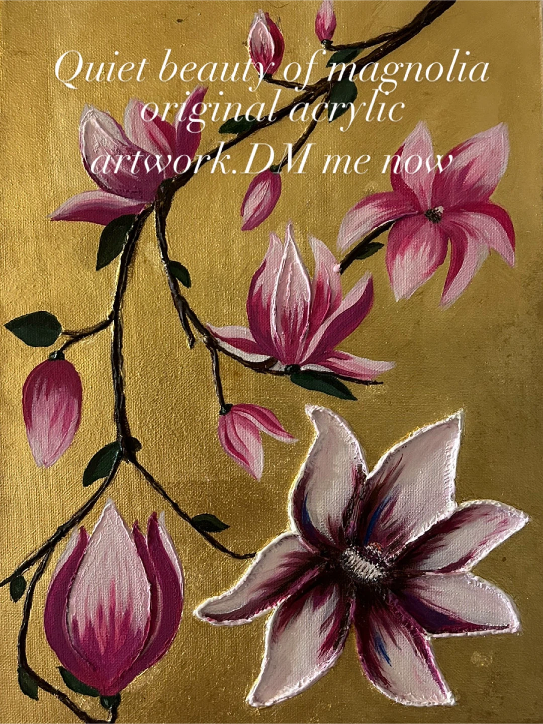 This is an original acrylic painting featuring the quiet beauty of magnolias. It's painted on canvas with a gold background. Perfect for adding a touch of elegance to any room!
