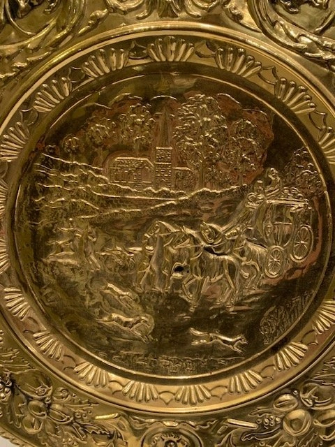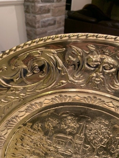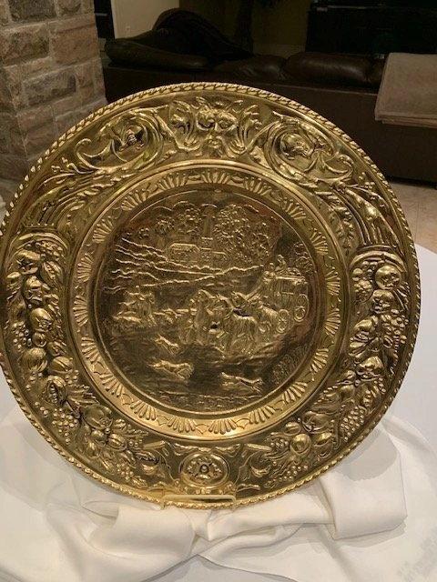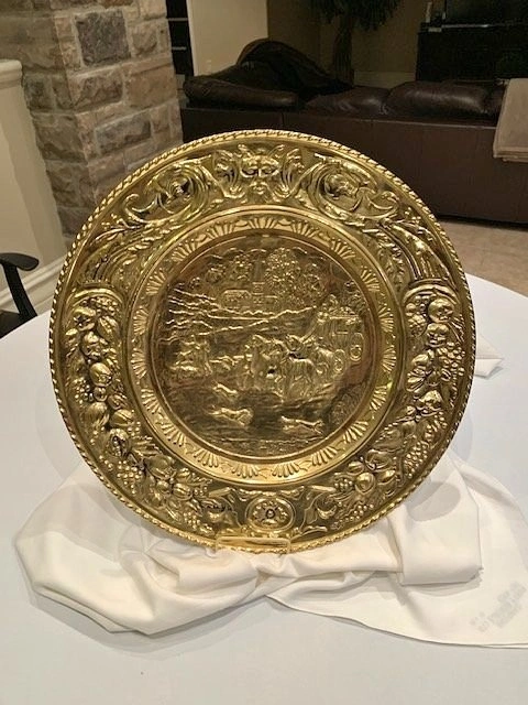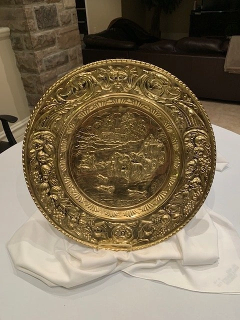 This is a vintage brass wall plate or plaque from the mid-20th century. It has a marking on the back that says 'Made In England'. Crafted from brass, it features an intricate embossed scene. The plate has some natural patina. Smoke Free- Pet Free Home. Cash Only. Located Richmond Hill - Bathurst and King Rd.