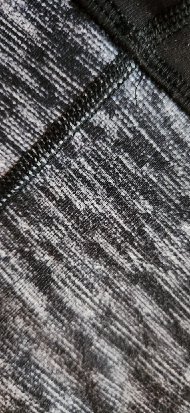 Lululemon yoga pants in a black and grey heathered pattern. It's a bootcut style with a comfortable waistband. These pants are made for activities like yoga or lounging.