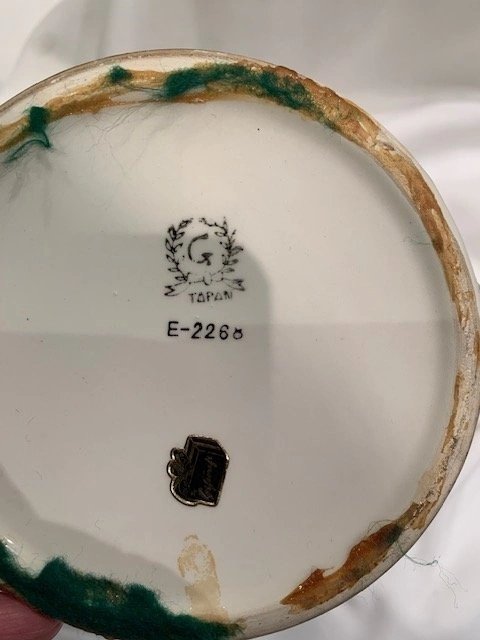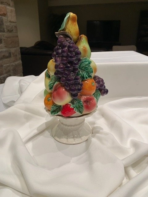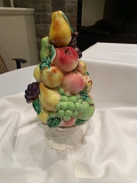 Stunning vintage ceramic fruit topiary centerpiece, likely a Capodimonte or Majolica style piece made by a company such as Inarco. It features a vibrant, hand-painted arrangement of various sculpted fruits, including grapes, peaches, apples, and citrus, on a pedestal base. Similar items are often identified with the maker's mark " INARCO MARKED E-2268 or "J-852" on the bottom and were made in Japan. These decorative pieces were popular in the mid-20th century and are used as table centerpieces. It has a gloss finish, bright colors, and measures approximately 13-14 inches tall. No chips, no cracks, no crazing. Mint condition. Bottom stamped E - 2268. Smoke free, pet free home. Located in Richmond Hill near Bathurst and King Rd. Cash only.