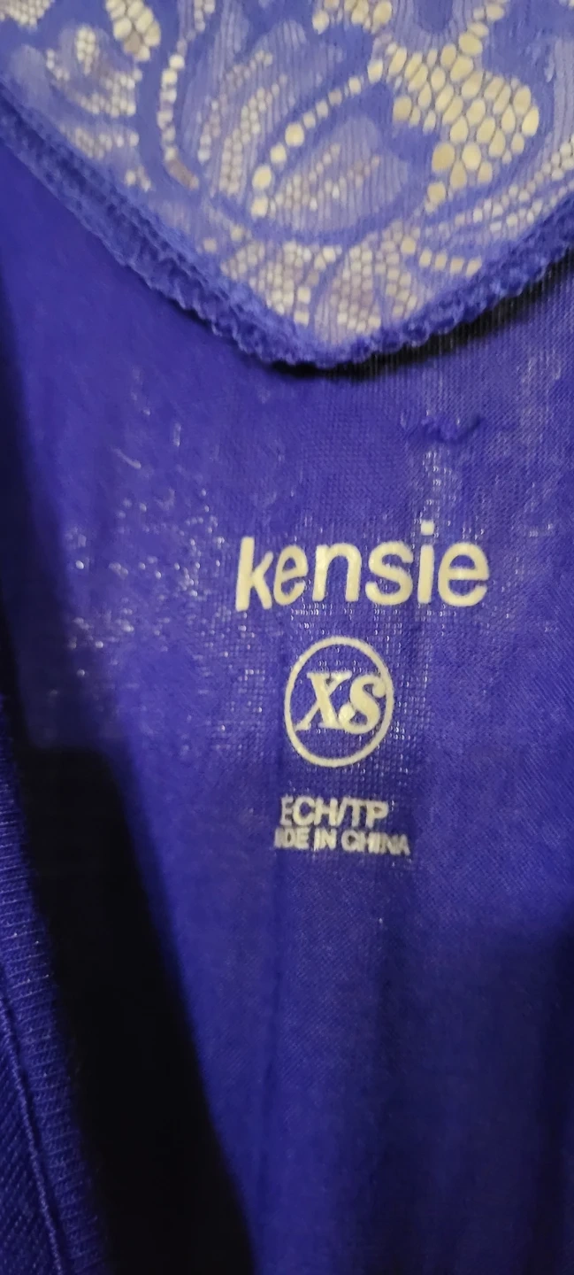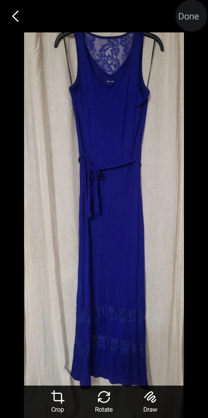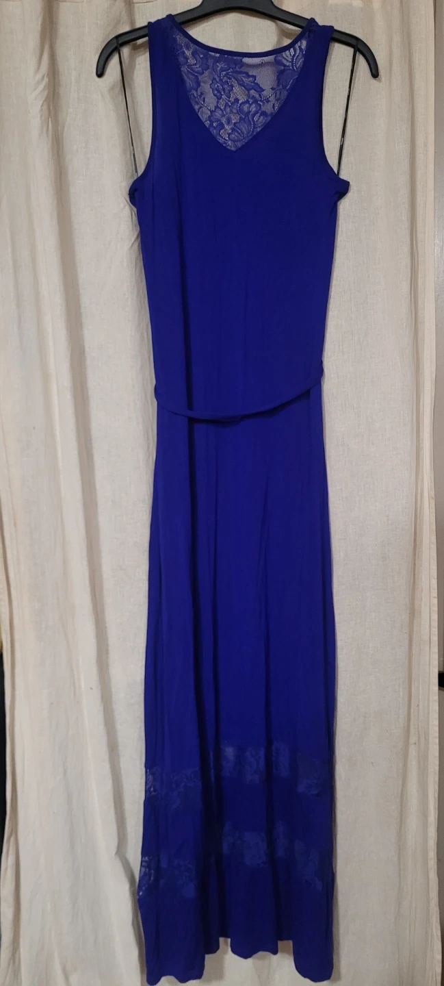 This is a Kensie brand cobalt blue maxi dress. It features lace detailing on the V-neck and hem. A tie belt is included. Size XS, stretches to medium