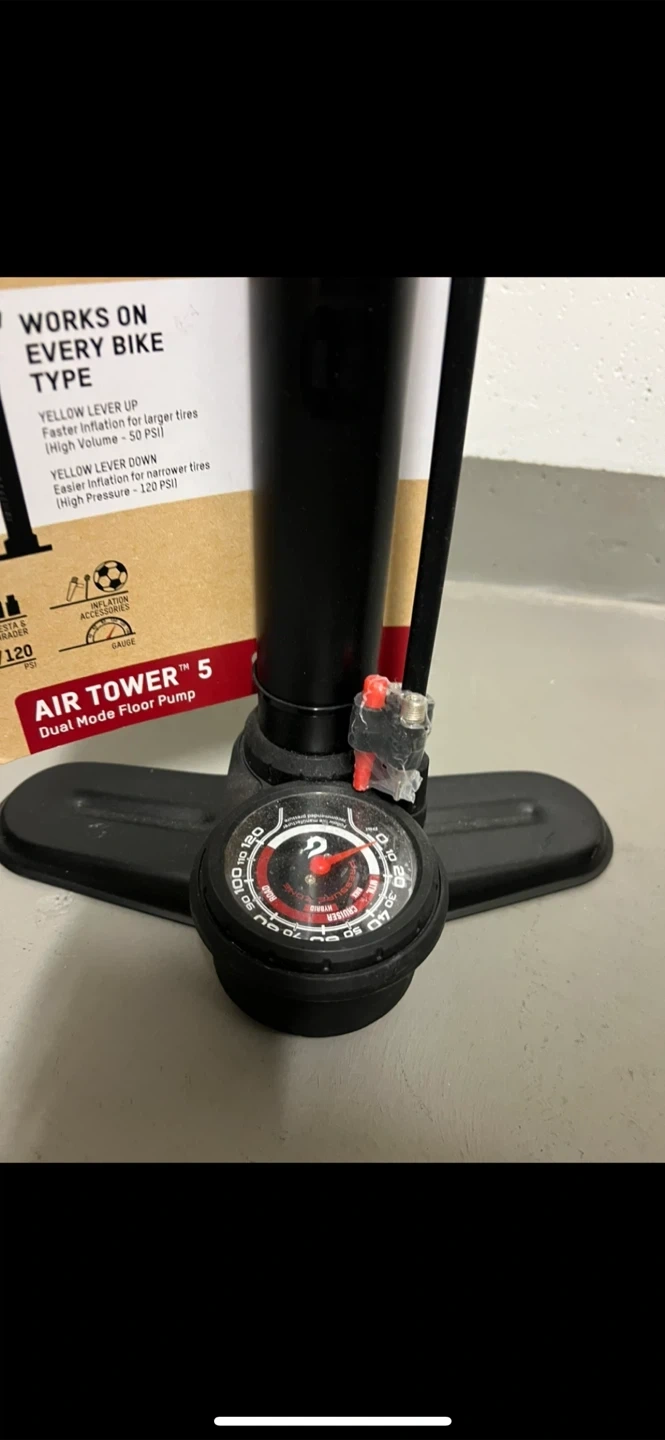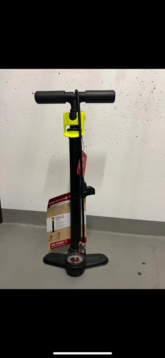 Blackburn Air Tower 5 dual mode floor pump. Works on every bike type. Features a gauge and can reach up to 120 PSI. This pump is great for getting your tires back up to pressure quickly.