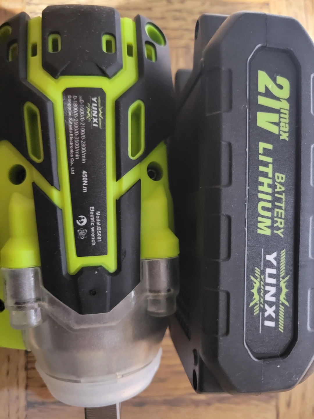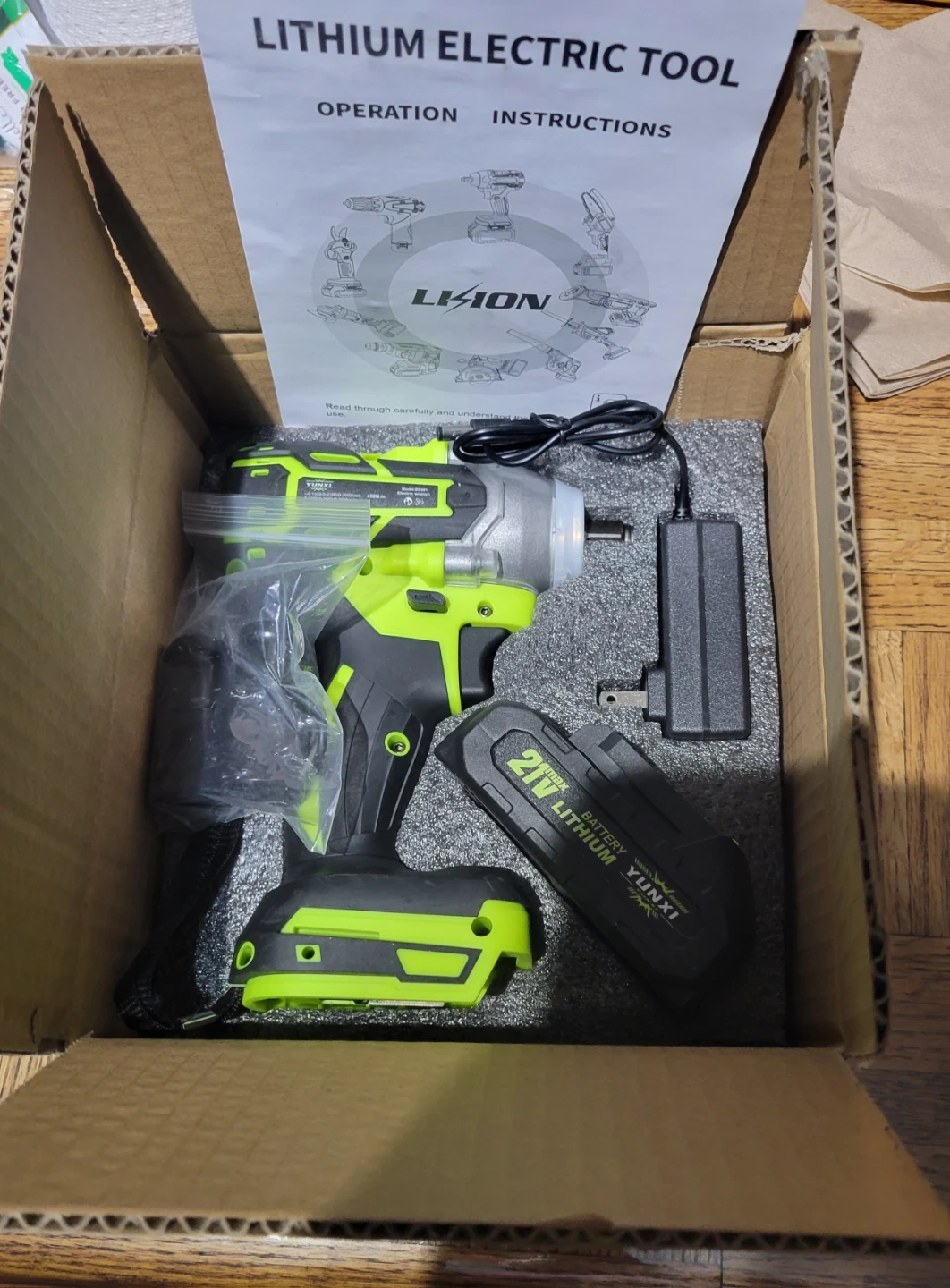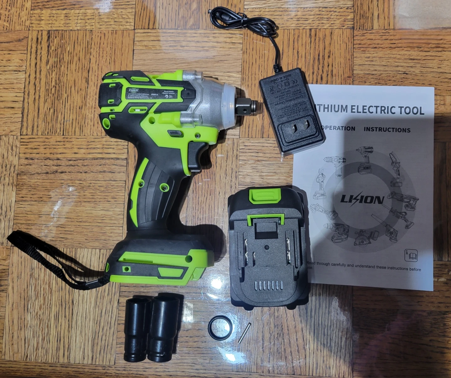 This YUNXI electric impact wrench comes with a 21V lithium battery and charger. It's a model BS001, featuring a brushless motor and 450 N.m of torque. Includes two sockets and instructions.