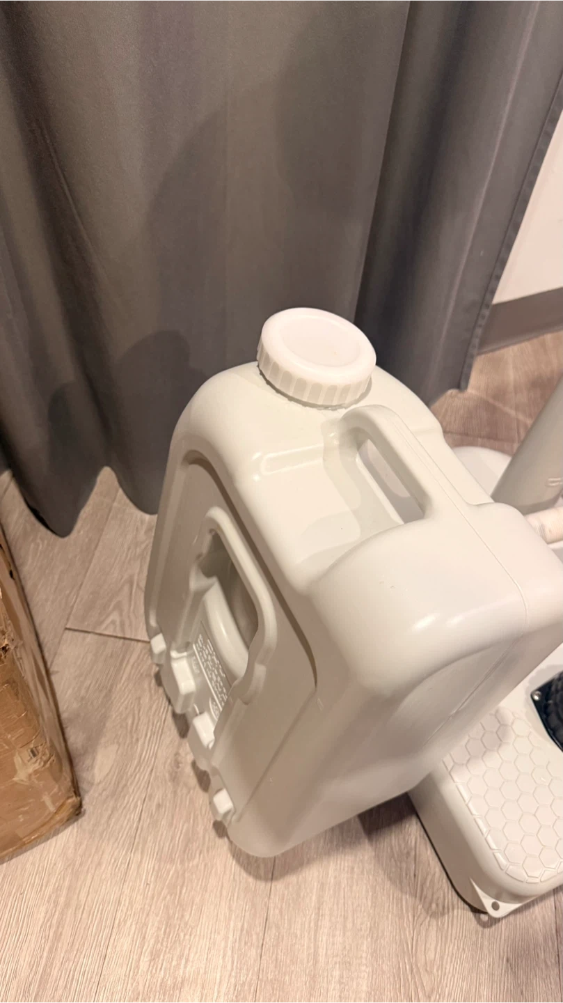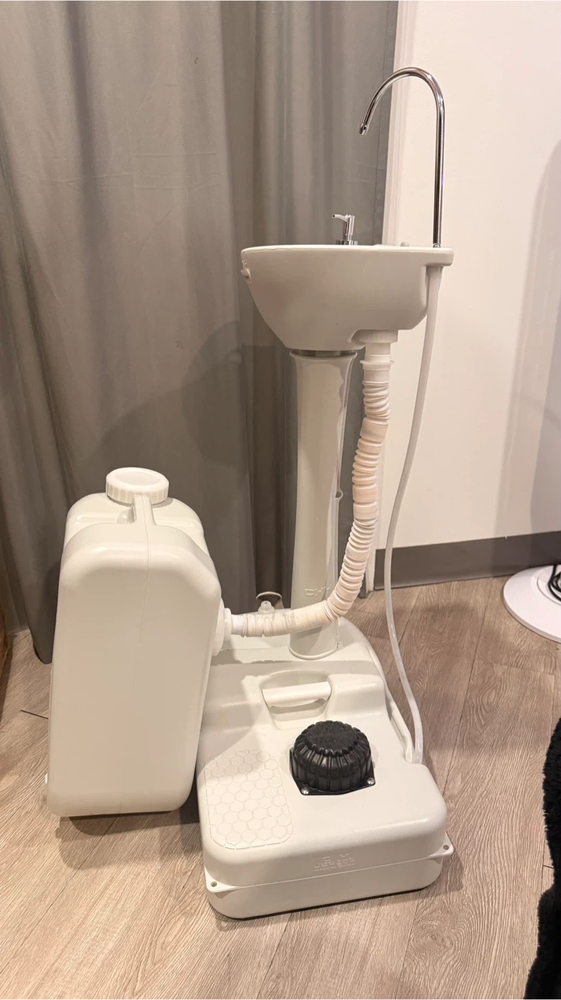 A portable sink unit with a foot pump for water dispensing. It comes with a large water storage tank. This sink is great for outdoor events or temporary setups.