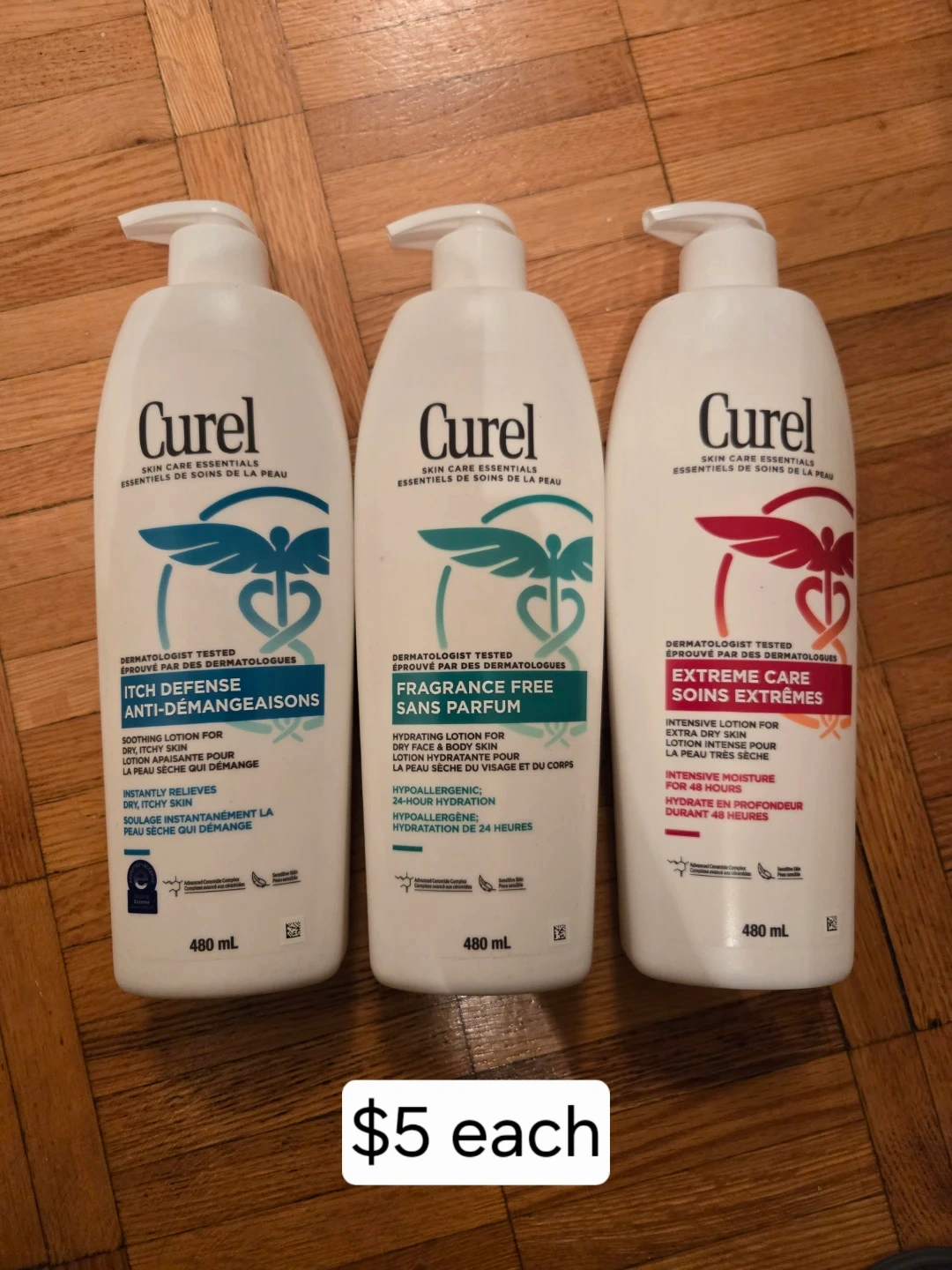 Curél body lotions are available in 480 mL bottles. Options include Itch Defense, Fragrance Free, and Extreme Care. These are dermatologist-tested formulas for dry and sensitive skin.
