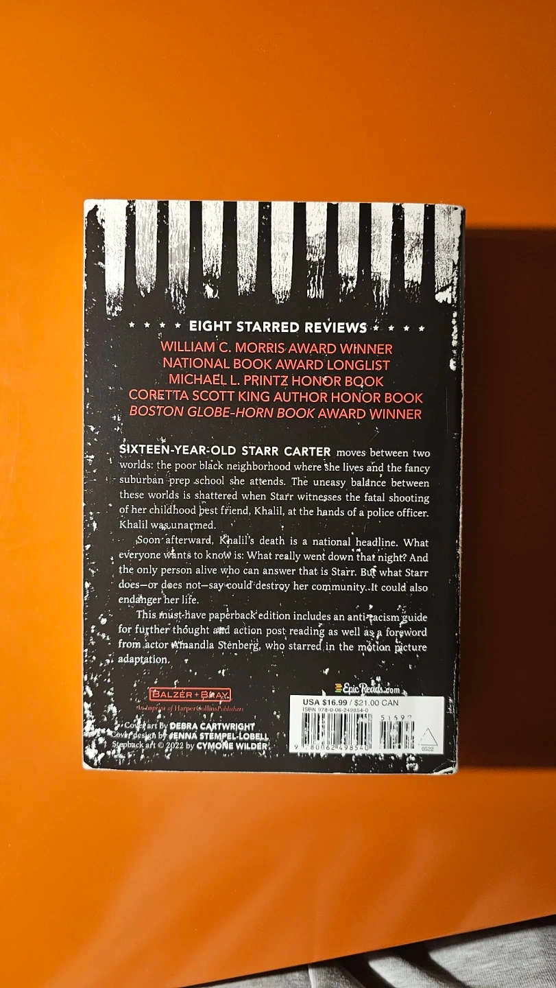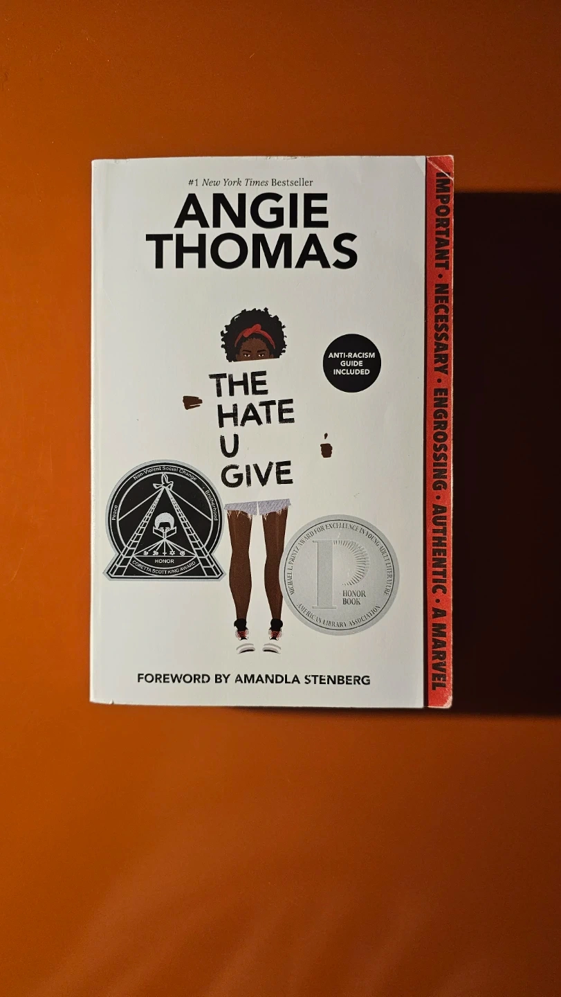 This is the #1 New York Times Bestseller "The Hate U Give" by Angie Thomas. It's a powerful novel about Starr Carter navigating life between her neighbourhood and her school. It includes an anti-racism guide.