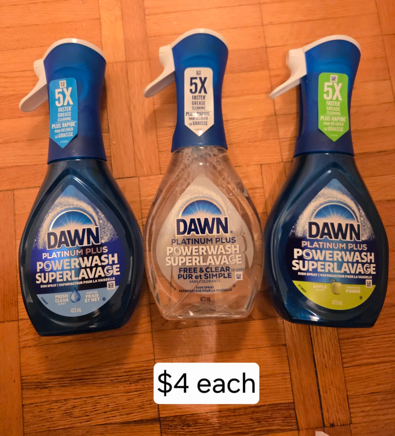 Dawn Platinum Plus Powerwash dish spray . Apple Scent, Fresh Clean Scent, and Free & Clear. Each bottle contains 473 ml. They offer 5x faster grease cleaning.