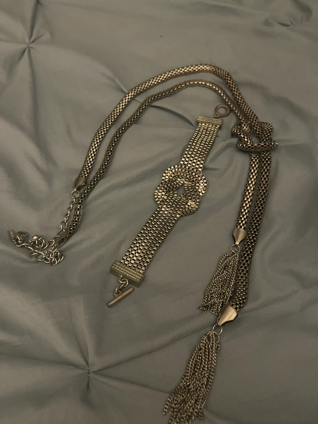 Stylish silver mesh chain necklaces with a unique knot detail and decorative tassels. It features a toggle clasp and an extender chain for adjustable fit. This belt adds a touch of elegance to any outfit!