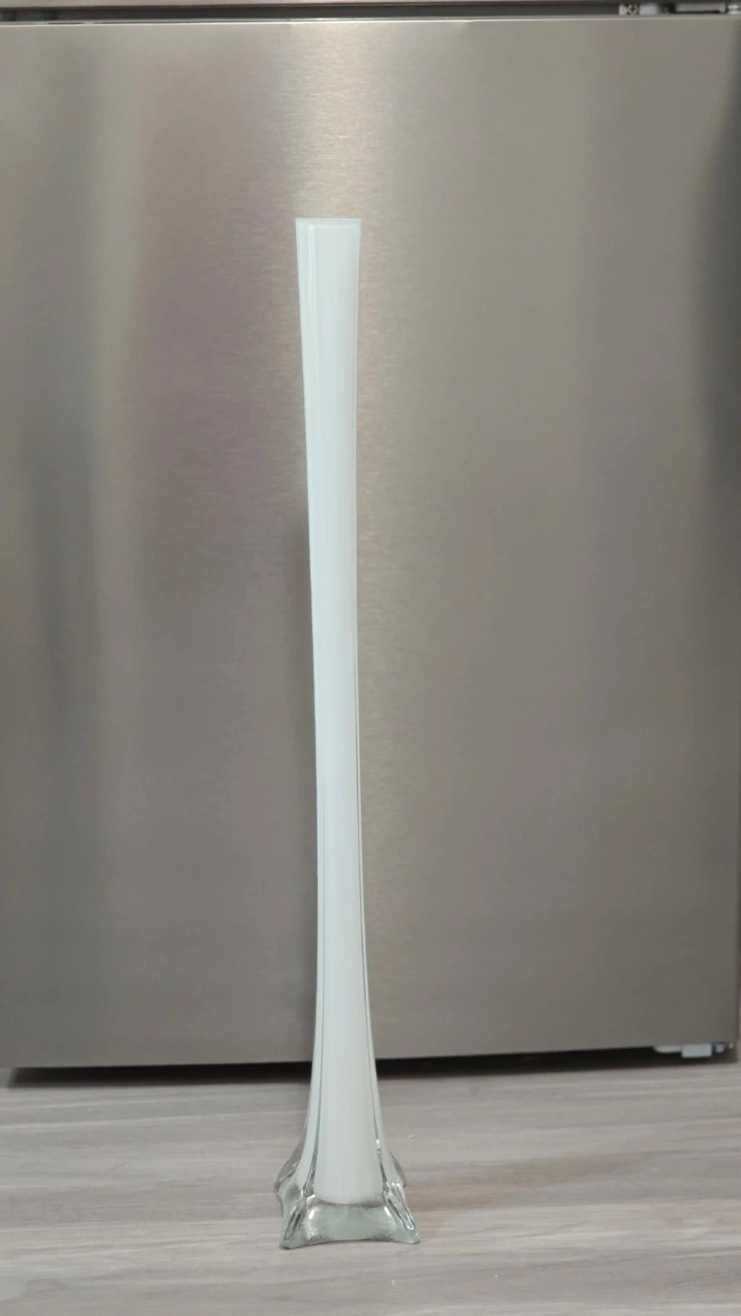 This is a beautiful tall bud vase with a frosted white glass finish. It has a flared square base and a slim, trumpet-shaped opening. Its height makes it a striking decorative piece for any room. Perfect for displaying single stems or small floral arrangements!