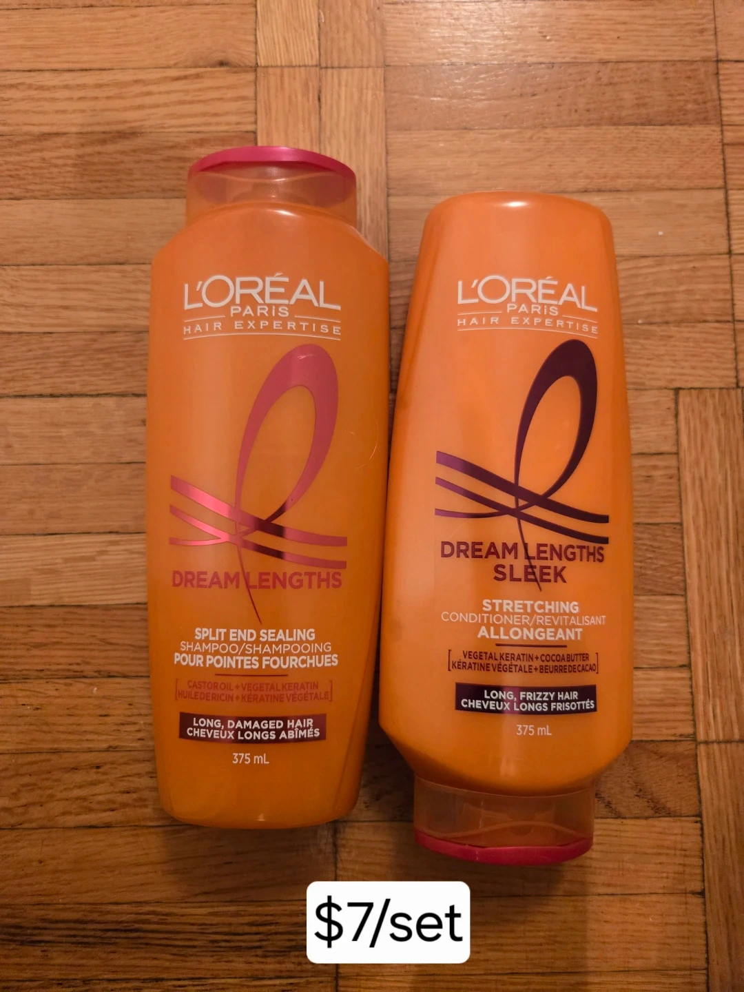 L'Oréal Paris Dream Lengths Split End Sealing Shampoo and Sleek Stretching Conditioner. Both bottles are 375 mL and are designed for long, damaged or frizzy hair. Contains castor oil, vegetal keratin, and cocoa butter.