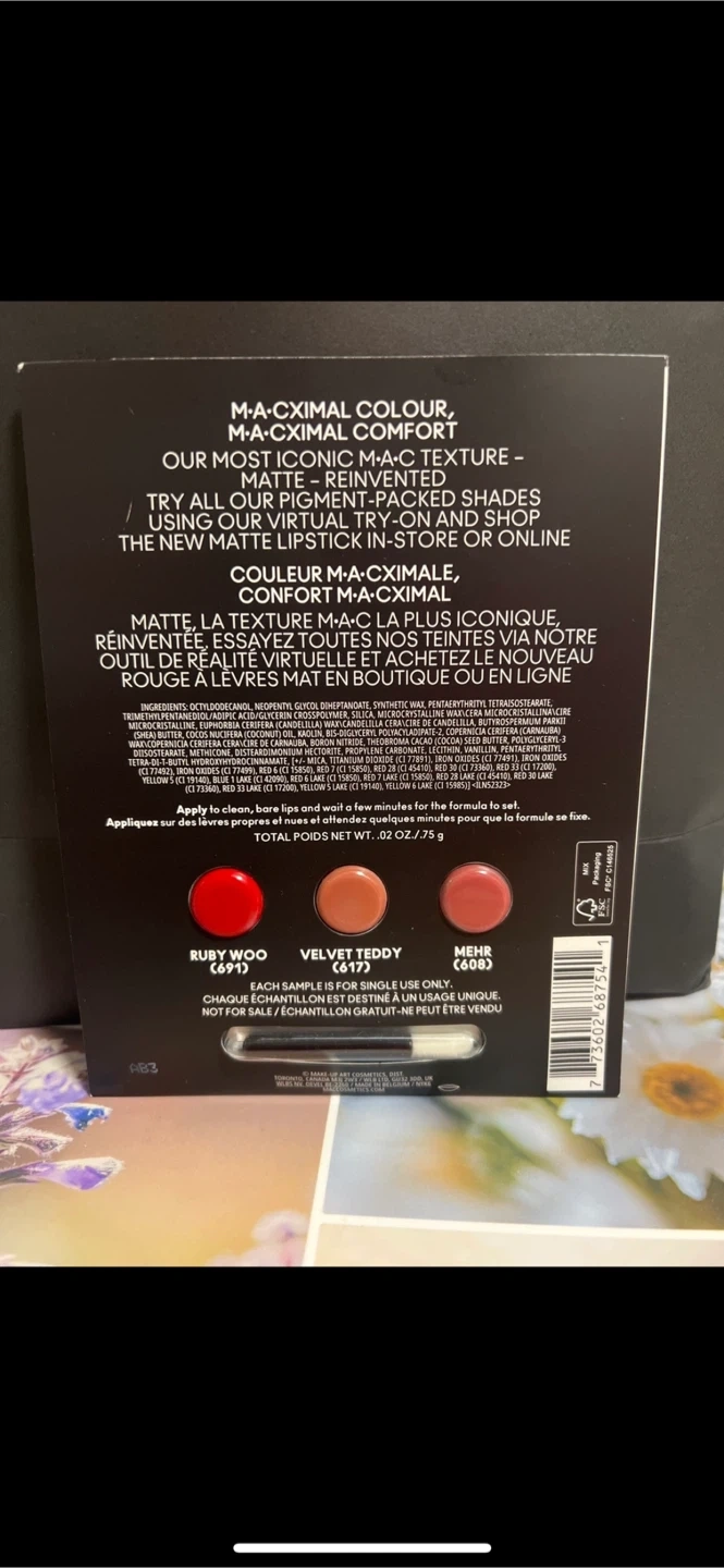 - MAC Matte Lipstick Sample with brush in Ruby Woo (691), Velvet Teddy (617), and Mehr (608)