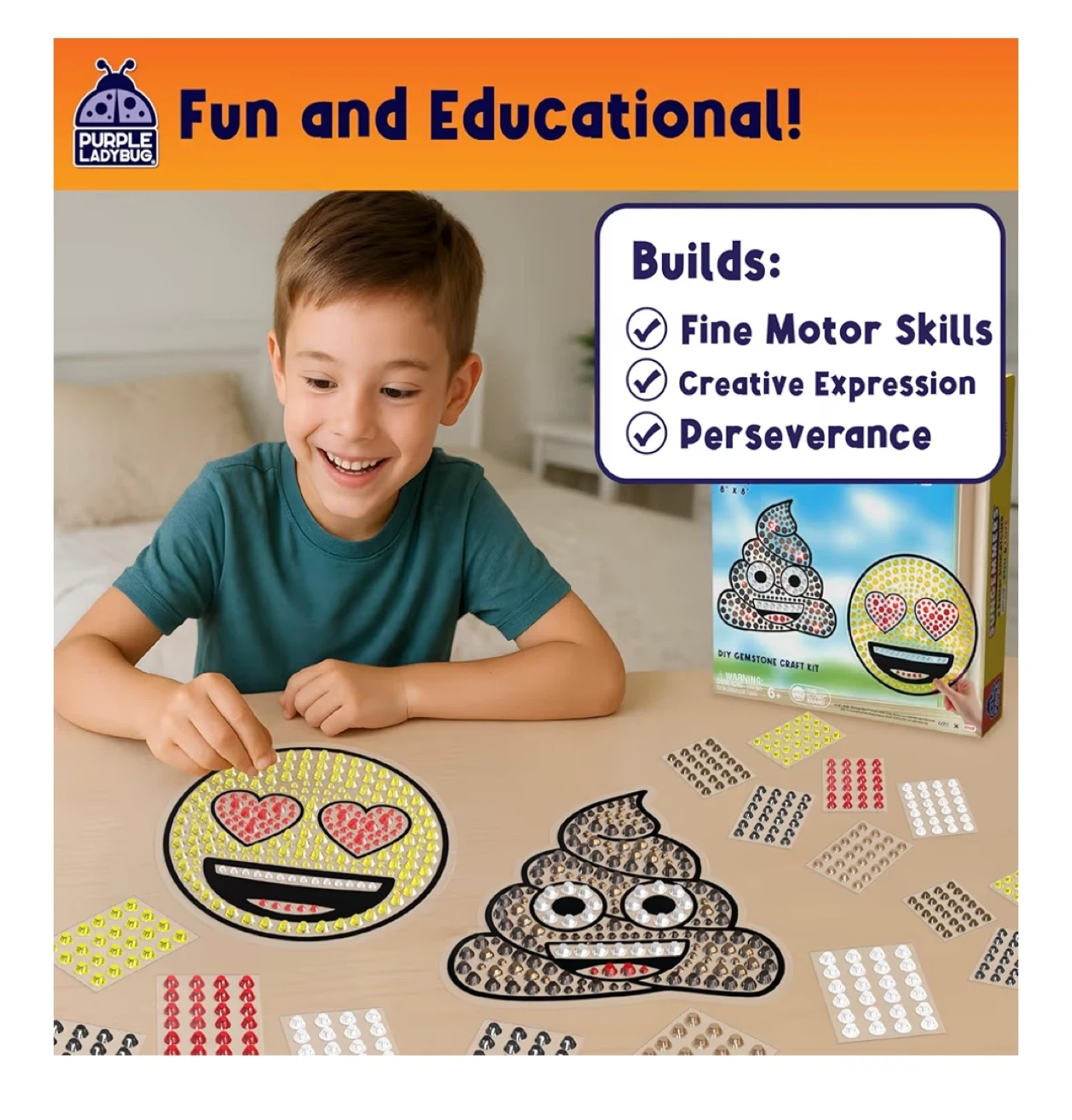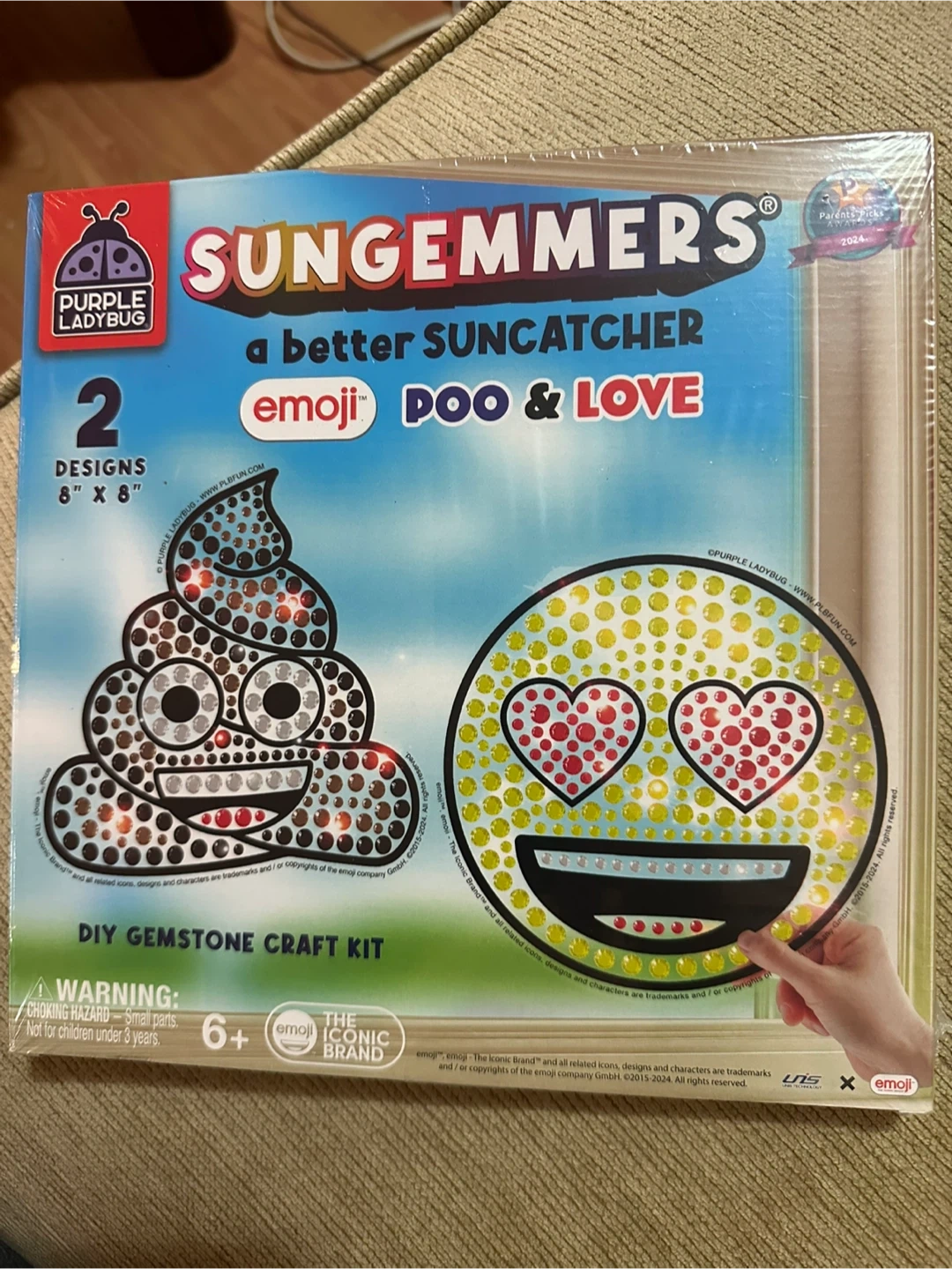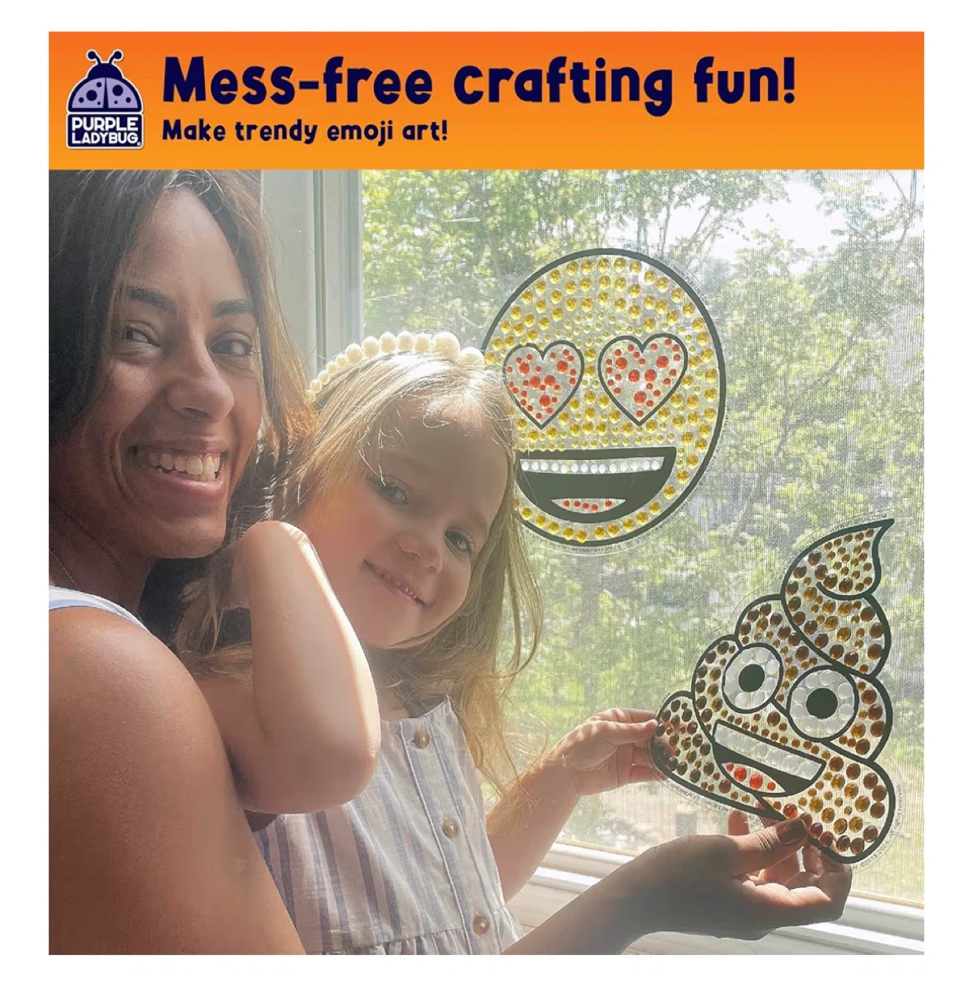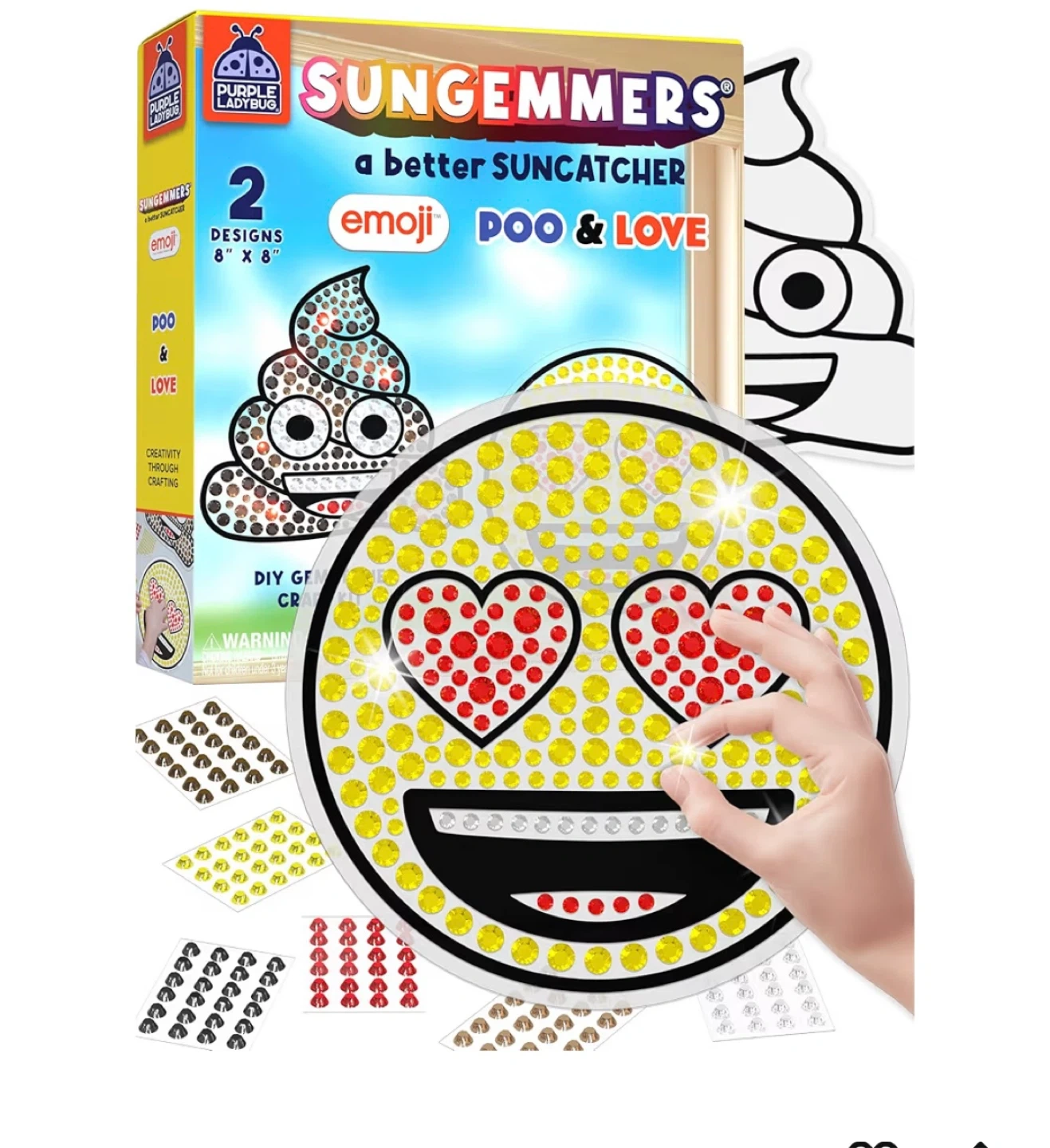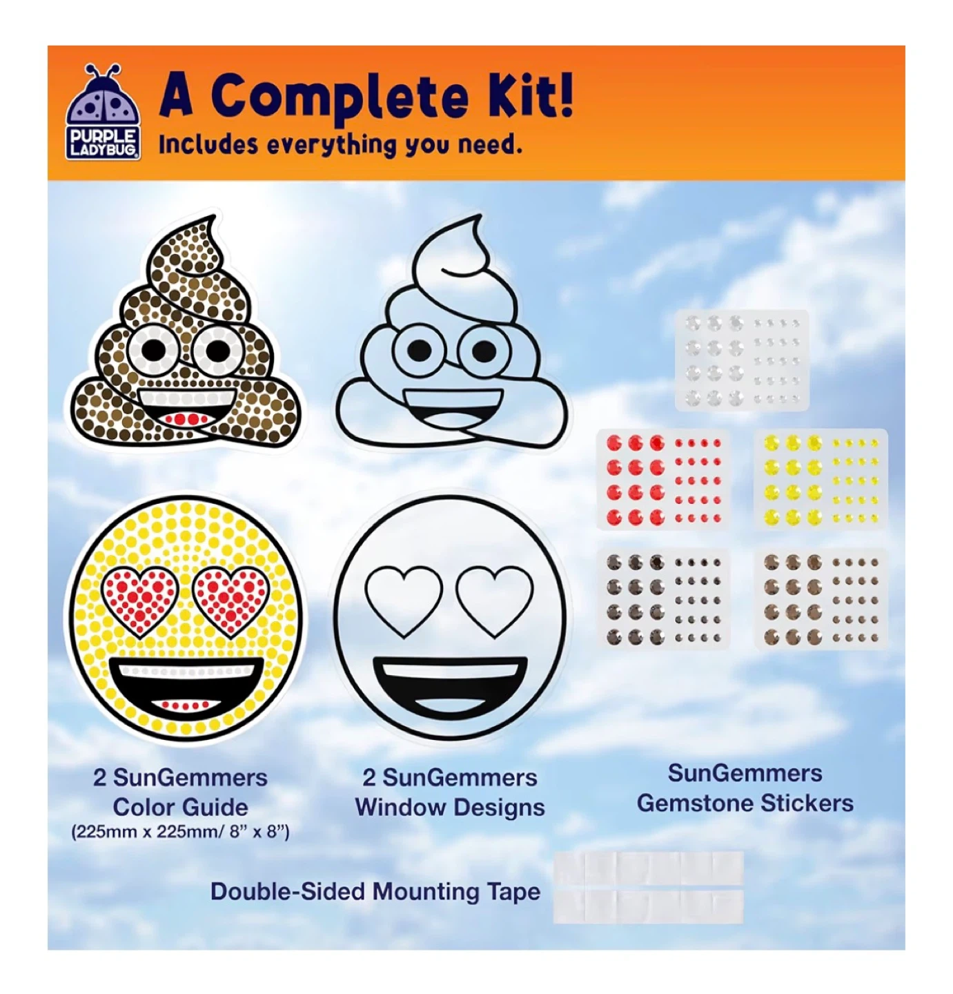 This Sungemmers Emoji Love & Poo kit lets you create two trendy suncatchers. It includes everything needed: two window designs, gemstone stickers, and mounting tape. Mess-free crafting fun for kids!