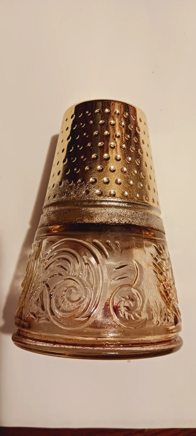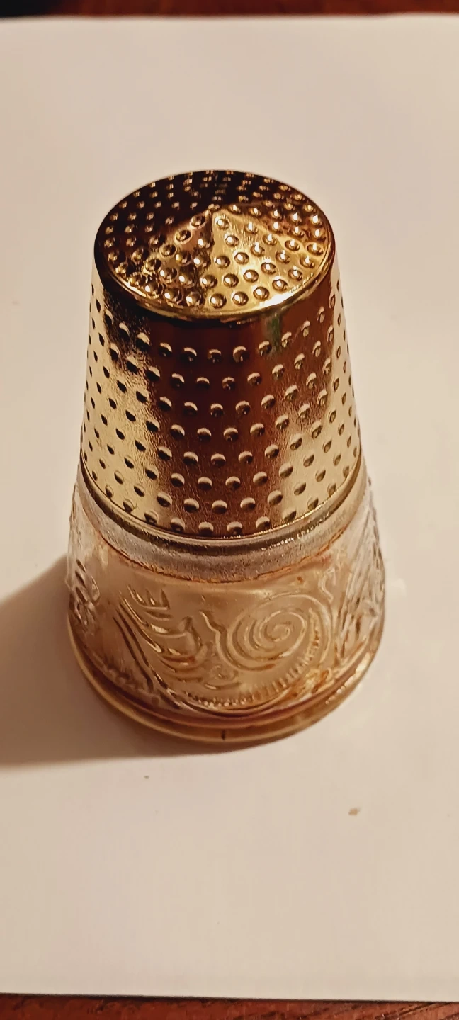 Collectible Vintage Empty Avon Perfume bottle shaped as a thimble with a gold-tone textured metal top and a clear glass base. The glass features an embossed floral pattern. It's designed for sewing and protecting fingers, cute perfume bottle. It's empty !!