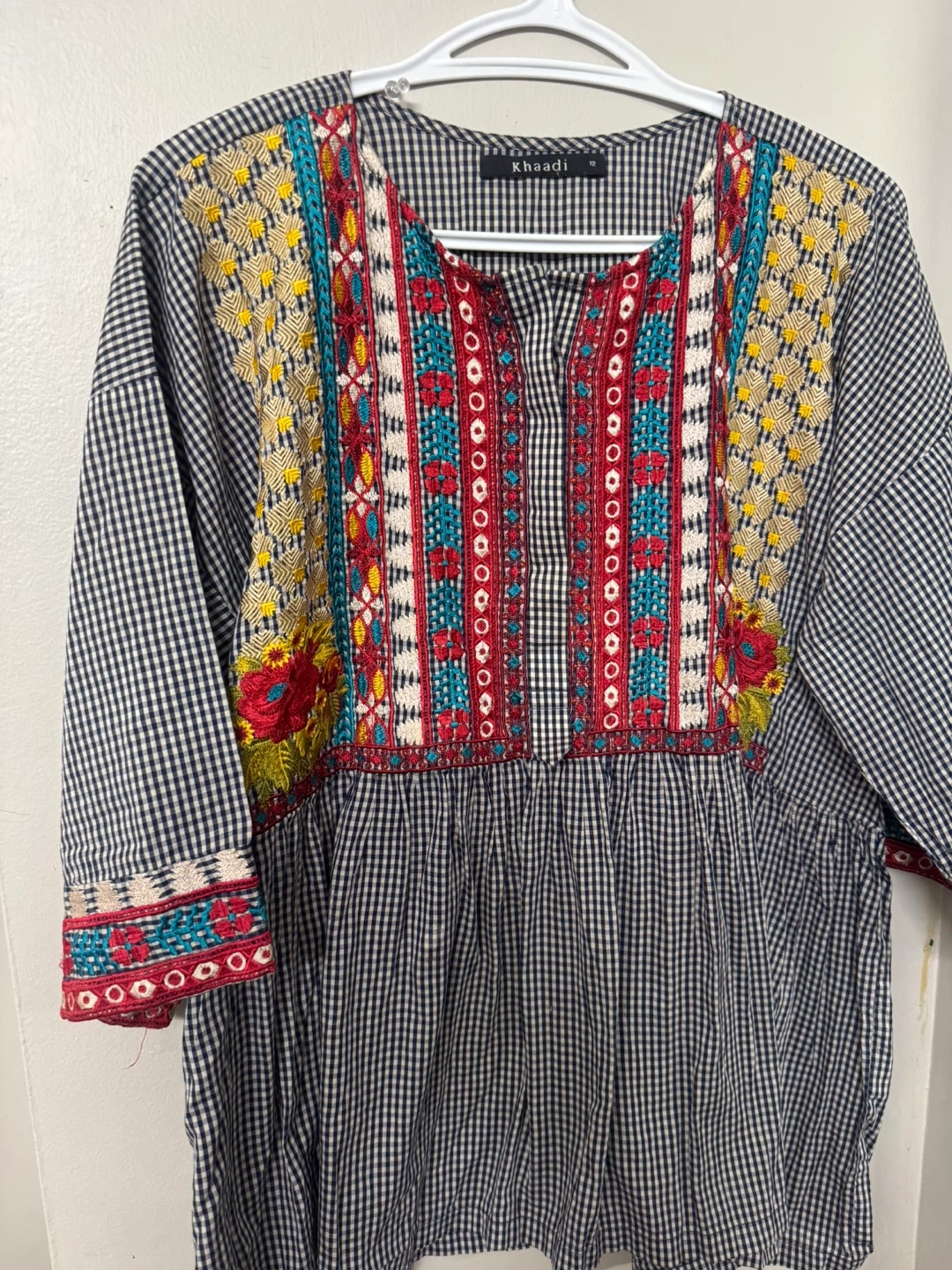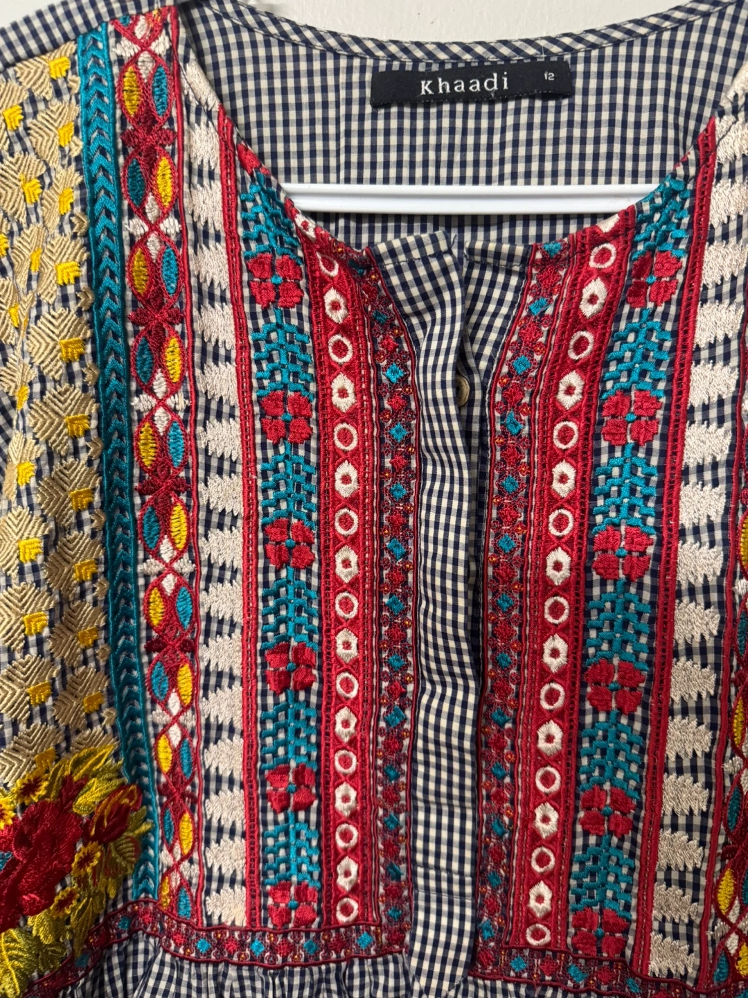 This Khaadi tunic features a black and white gingham pattern with vibrant embroidered detailing on the bodice and sleeves. It's a size 12 with a flattering empire waist silhouette. This piece is perfect for adding a pop of colour to your casual wardrobe!