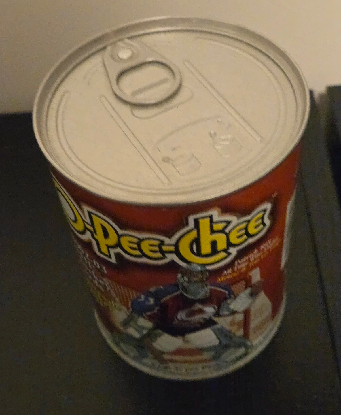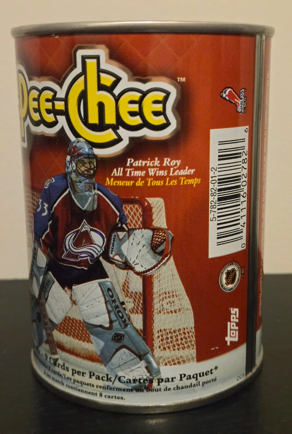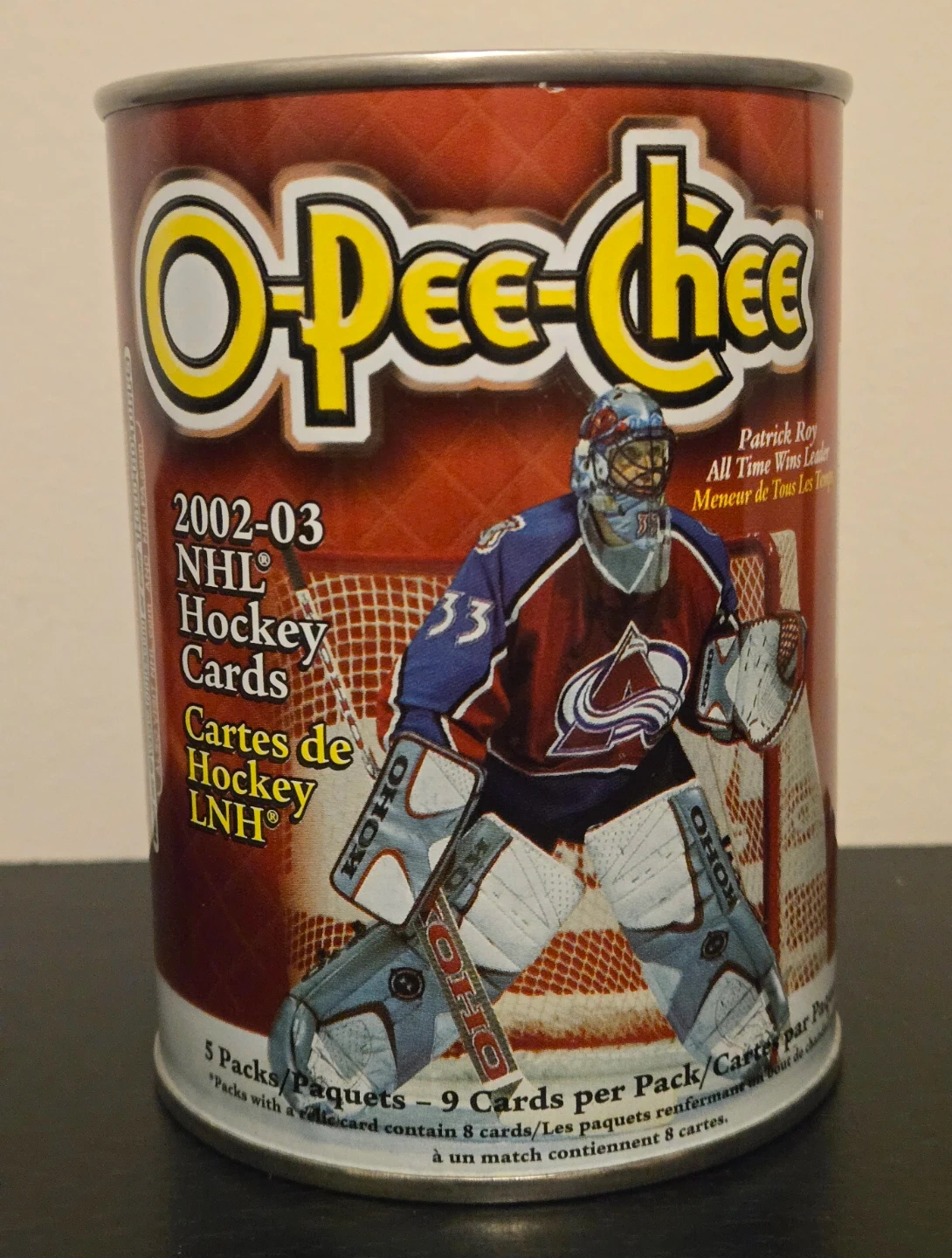 This is a O-Pee-Chee 2002-03 NHL hockey card tin featuring Patrick Roy. It contains 5 packs with 9 cards per pack. It's a collector's item for hockey fans!