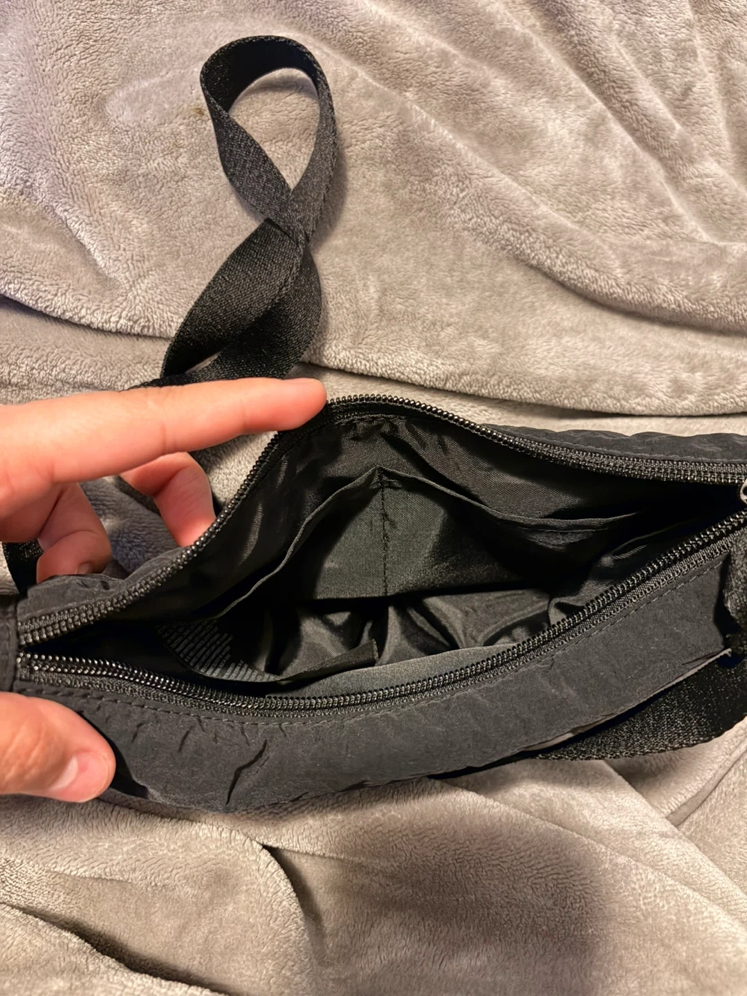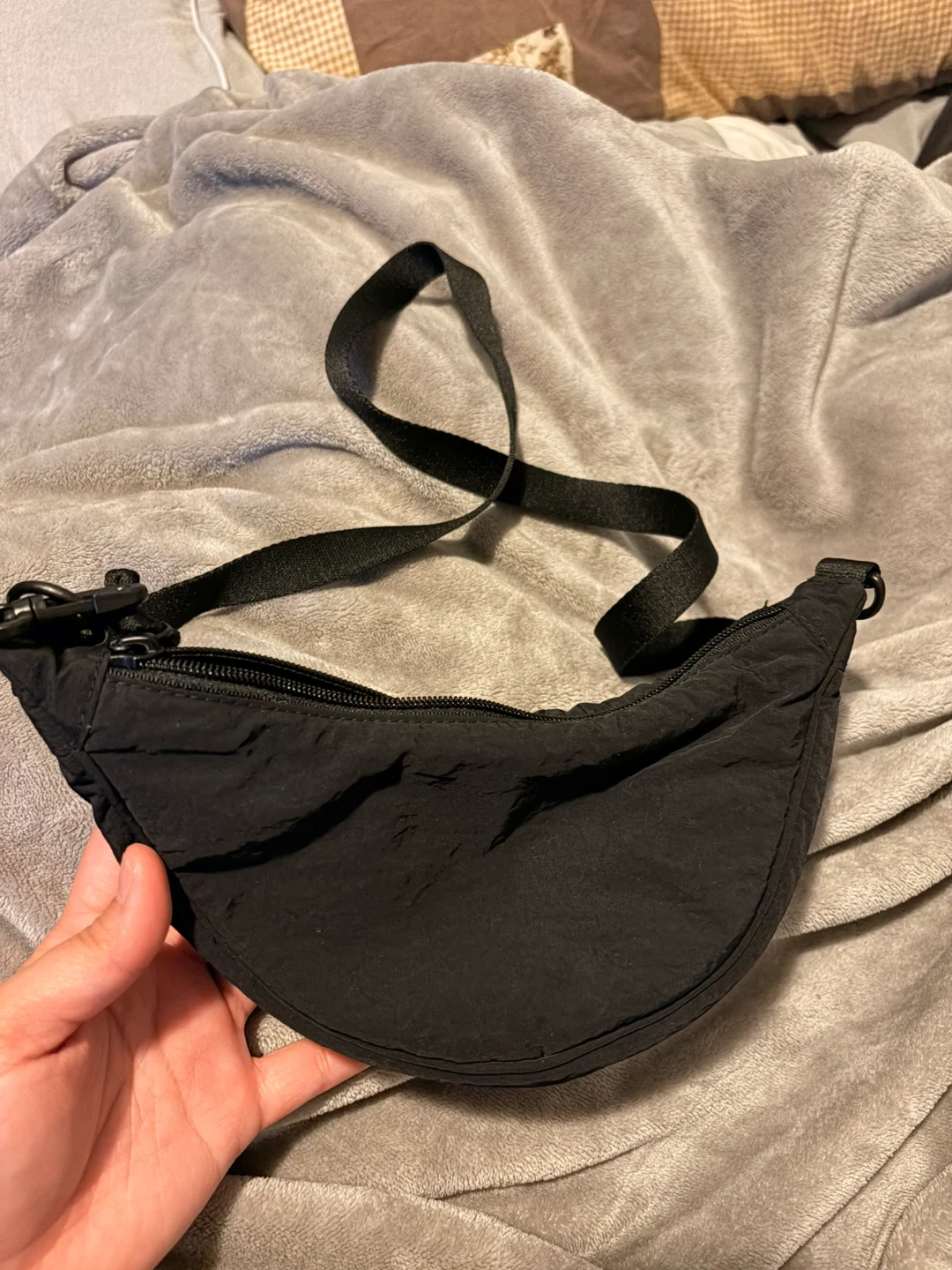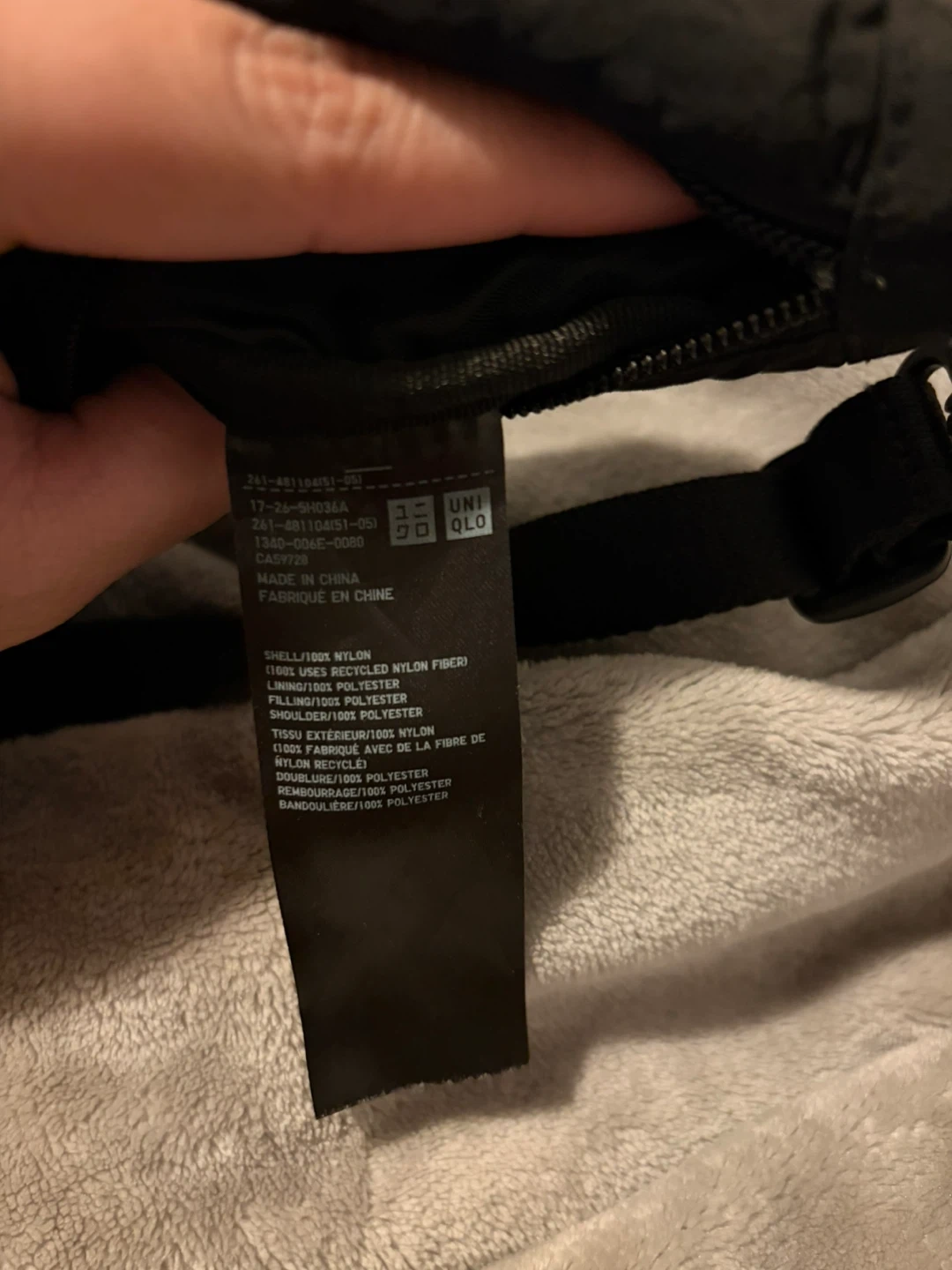 This Uniqlo belt bag is made from 100% nylon with recycled polyester filling. It's a handy size for everyday essentials! Great for carrying your phone, wallet, and keys.