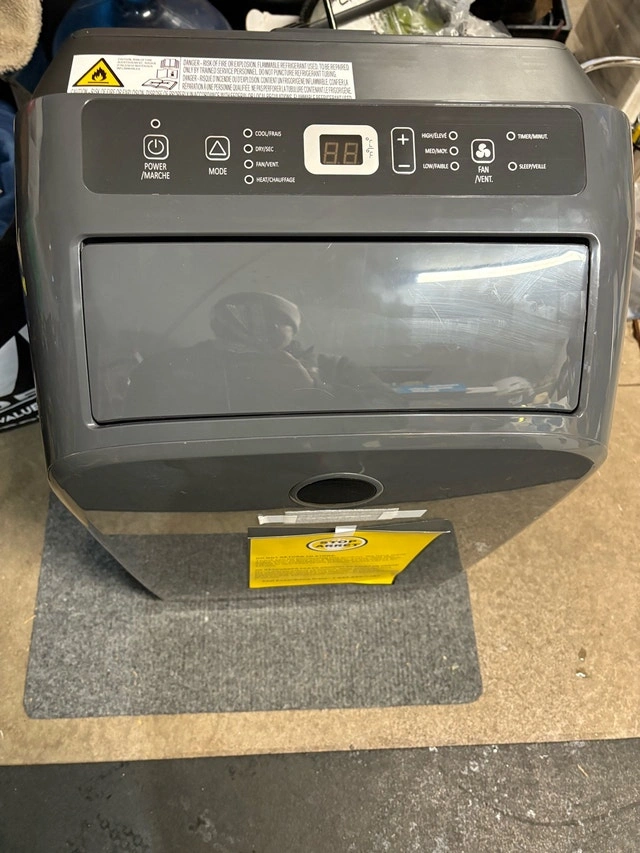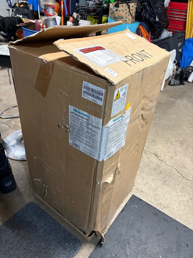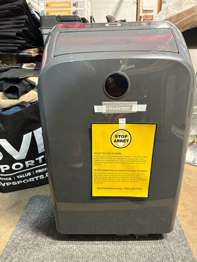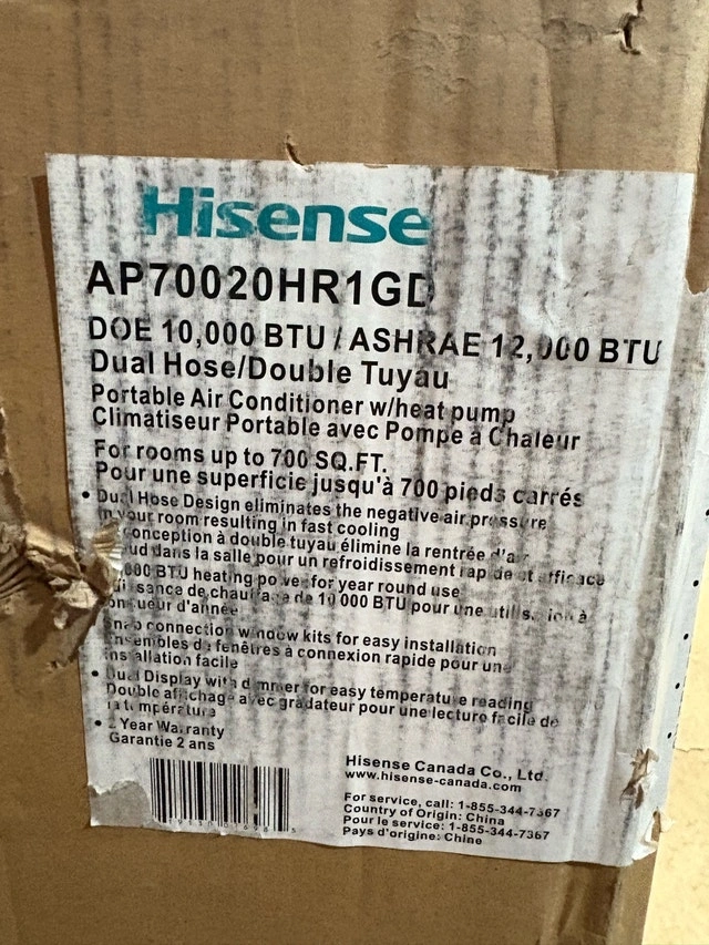 Keep cool with this Hisense portable air conditioner, designed to efficiently cool your space with its adjustable settings. This unit is in new condition, ready to provide relief from the heat. It has adjustable fan speeds, easy-to-use controls, and a portable design with wheels. It cools up to 700 square feet. This unit also has a heater, fan, and dehumidifier. It is brand new in the box and comes with all attachments to vent out the window, a remote control, and manuals. If you're reading this, it's still available! It retails for over $500 plus tax.