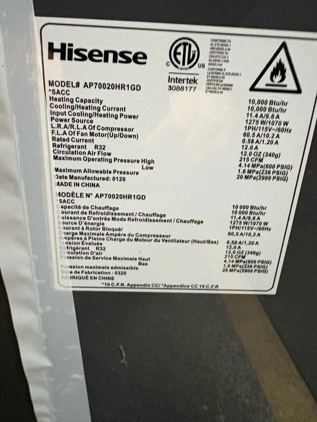 Hisense Portable Air Conditioner/Heater/Fan/Dehumidifier