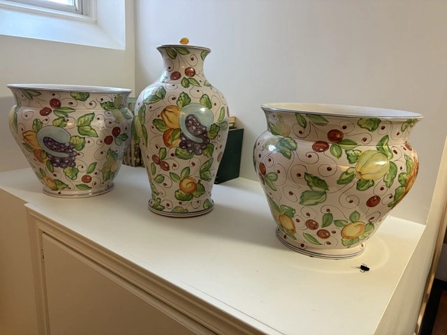 This beautiful set of three Italian pottery pieces features a vibrant fruit design and is in used condition, showcasing its vintage charm. The set includes a vase and two bowls, each hand-painted with intricate details reminiscent of classic Italian artistry. Perfect for adding a touch of rustic elegance to any home decor. If the ad is up, it's still available! Cash accepted.