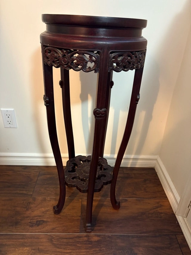 Elegant used marble top plant stand with an ornamental design and curved legs. The marble is white with a reddish-brown wood base. Stands approximately 30 inches tall. Selling to make room for new furniture. It remains sturdy and visually appealing. Material: Wood, Marble. Colour: White, Reddish-Brown. Height: 30 inches. If the ad is up, it's available.