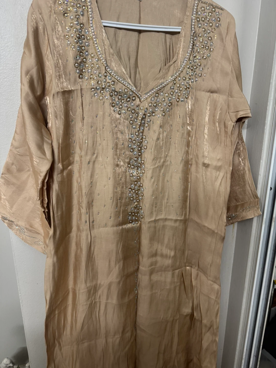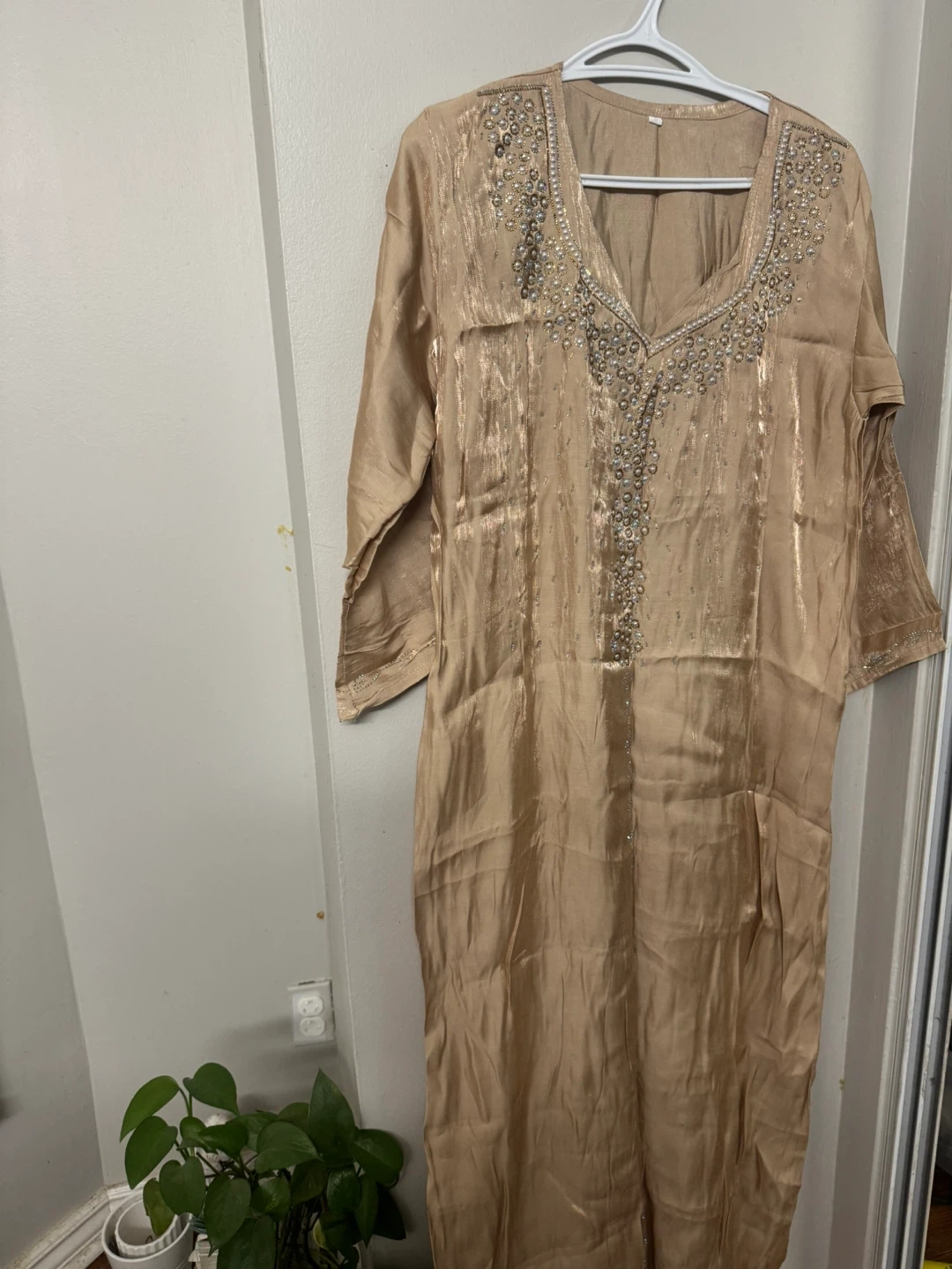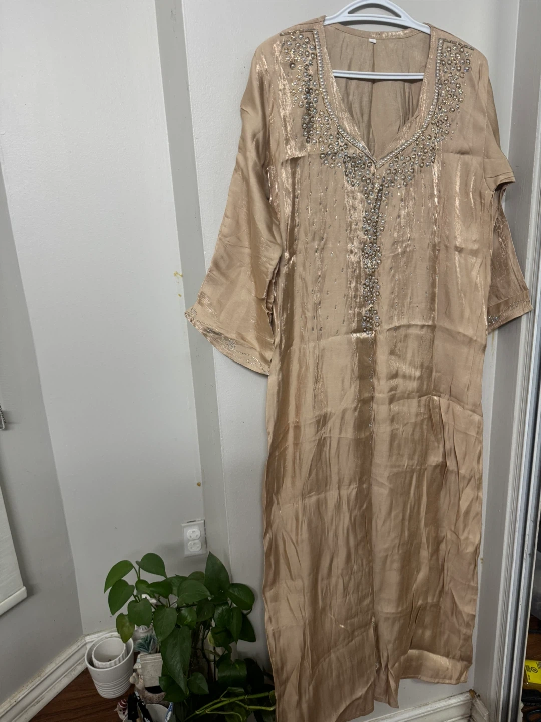 This beige kaftan features a shimmering fabric with intricate bead and rhinestone embellishments around the neckline and down the front. It has a V-neckline and 3/4 sleeves. Perfect for special occasions!