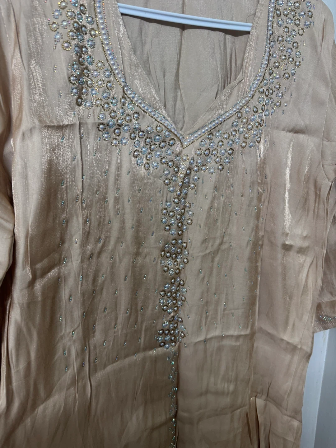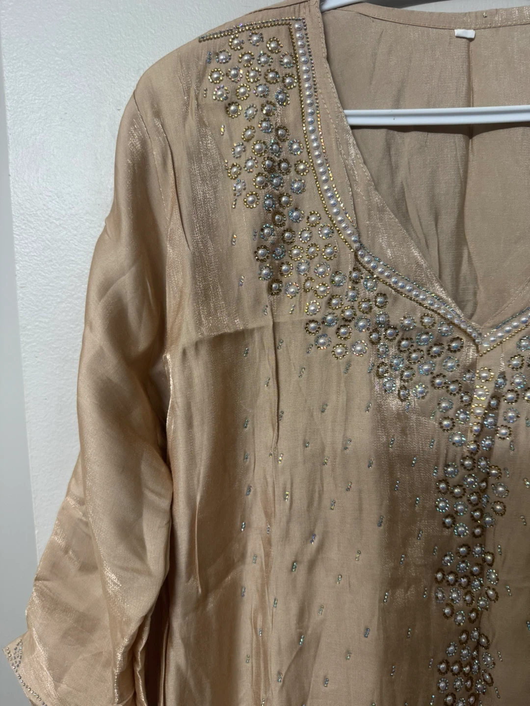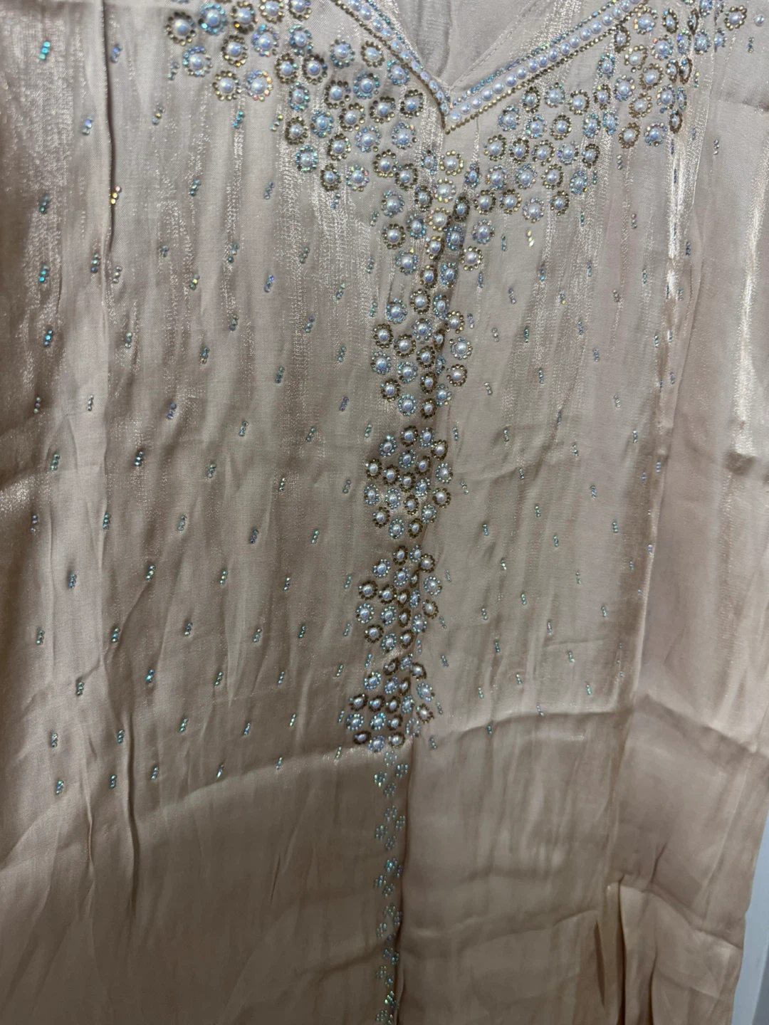 This beige kaftan features a shimmering fabric with intricate bead and rhinestone embellishments around the neckline and down the front. It has a V-neckline and 3/4 sleeves. Perfect for special occasions!