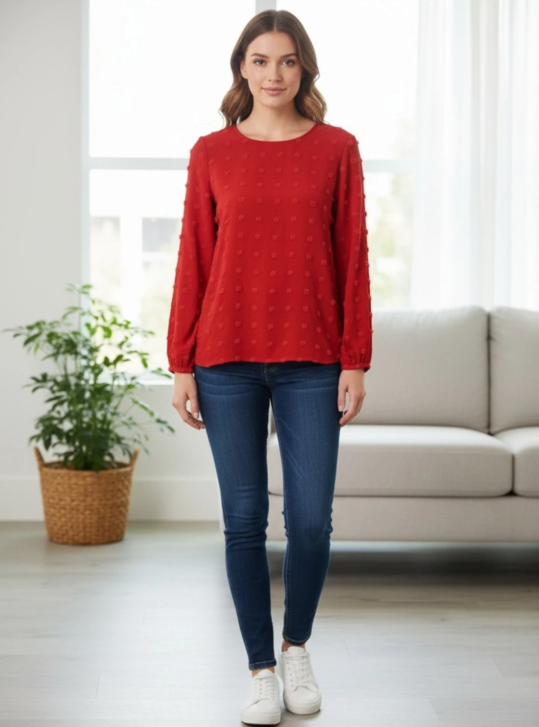 This red long sleeve top features a textured dobby dot design throughout. It has a crew neckline and long sleeves. Material appears to be a polyester blend.