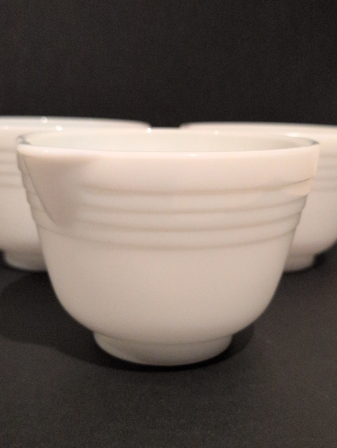 3 Vintage Pyrex Hamilton Beach Milk Glass Mixing Bowls. They feature a classic ribbed design and a small pour spout. 6"D, 4.5" H. No chips or cracks, perfect for the Pyrex enthusiast.