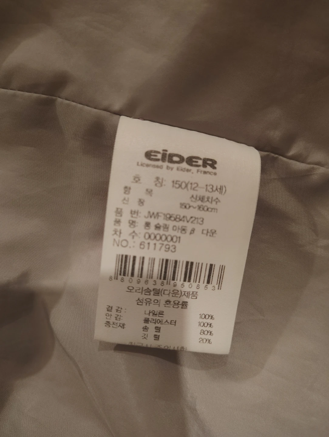 This is an Eider pink puffer coat. It's a size XL, which corresponds to 150cm for ages 12-13 years. The outer shell is made of 100% nylon, with 100% polyester filling and 80% down and 20% feather insulation. It has a comfortable grey lining and a hood for extra warmth.