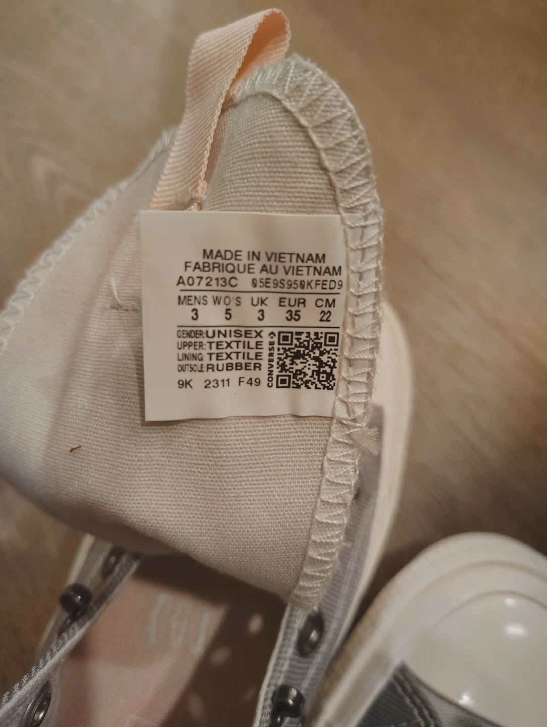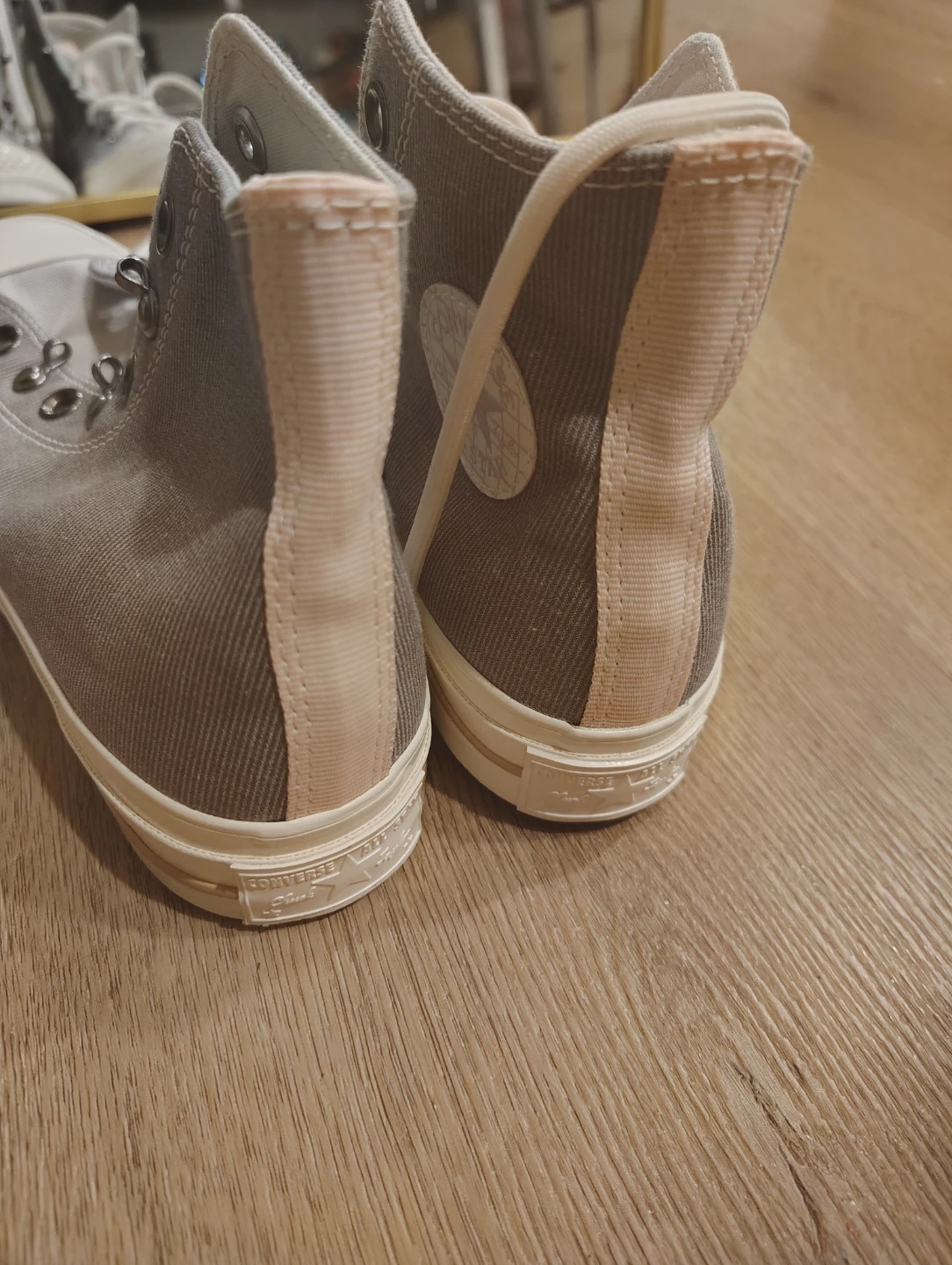 Classic high-top Converse Chuck Taylors in a neutral grey canvas with pink accents. Features the iconic Chuck Taylor ankle patch and durable rubber sole. These sneakers are a versatile addition to any wardrobe!