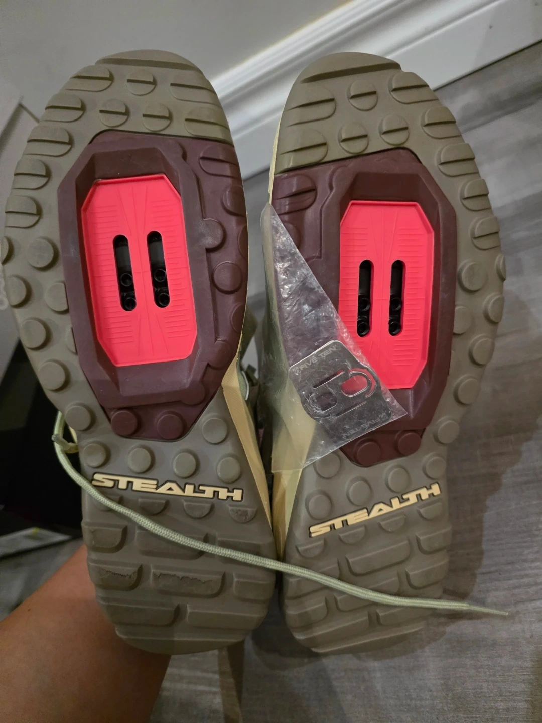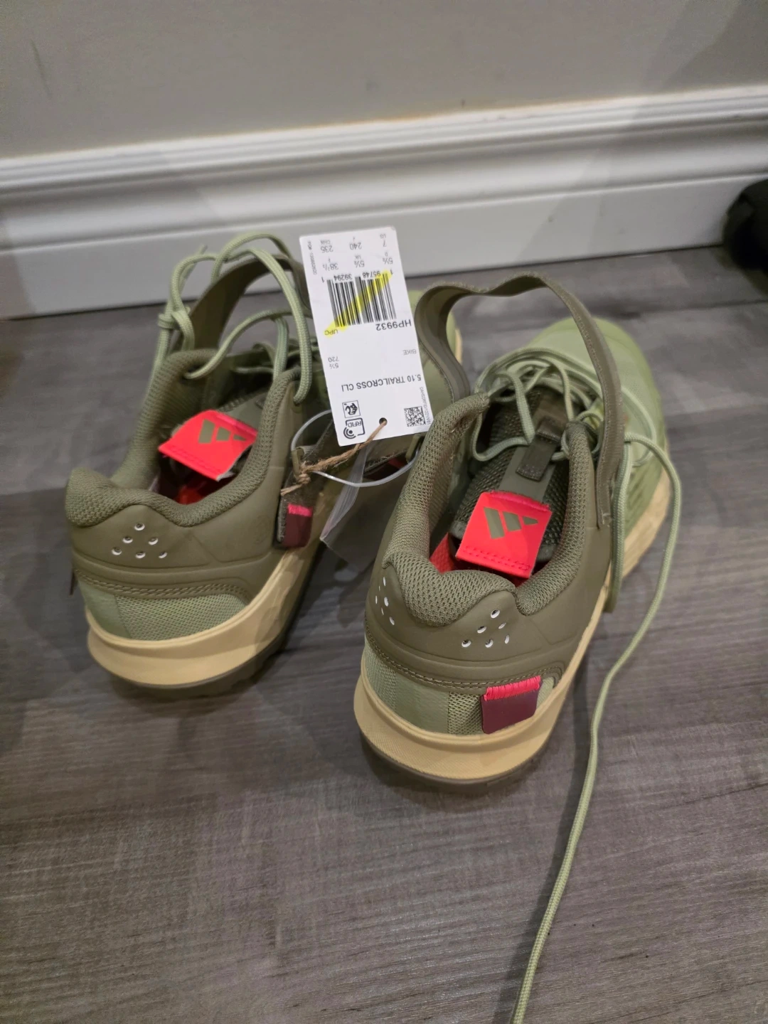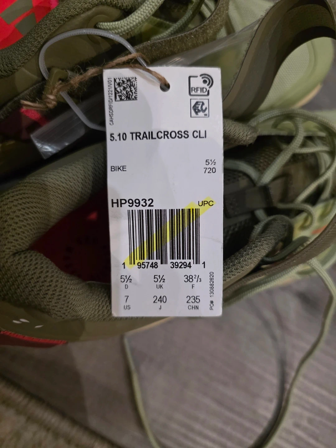 Adidas 5.10 Trailcross Cli bike shoes in an olive colour. They are size 7. The shoes feature Stealth rubber soles.