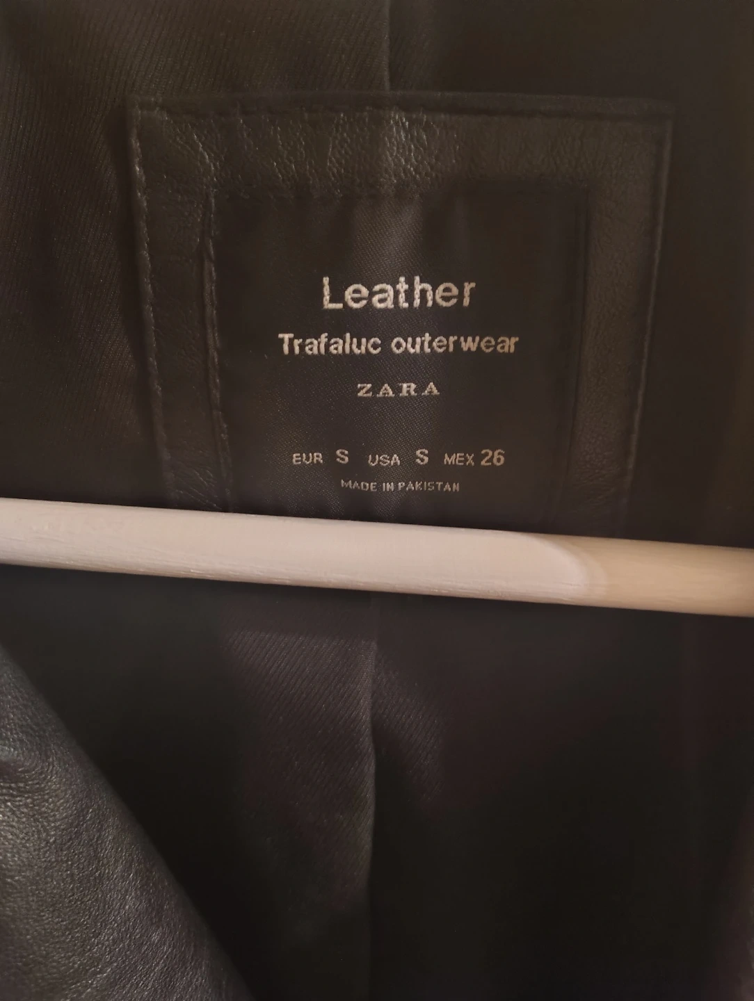 This is a ZARA leather biker jacket. It's black and made of leather. Features include metal zippers and a belted waist. Size is small.