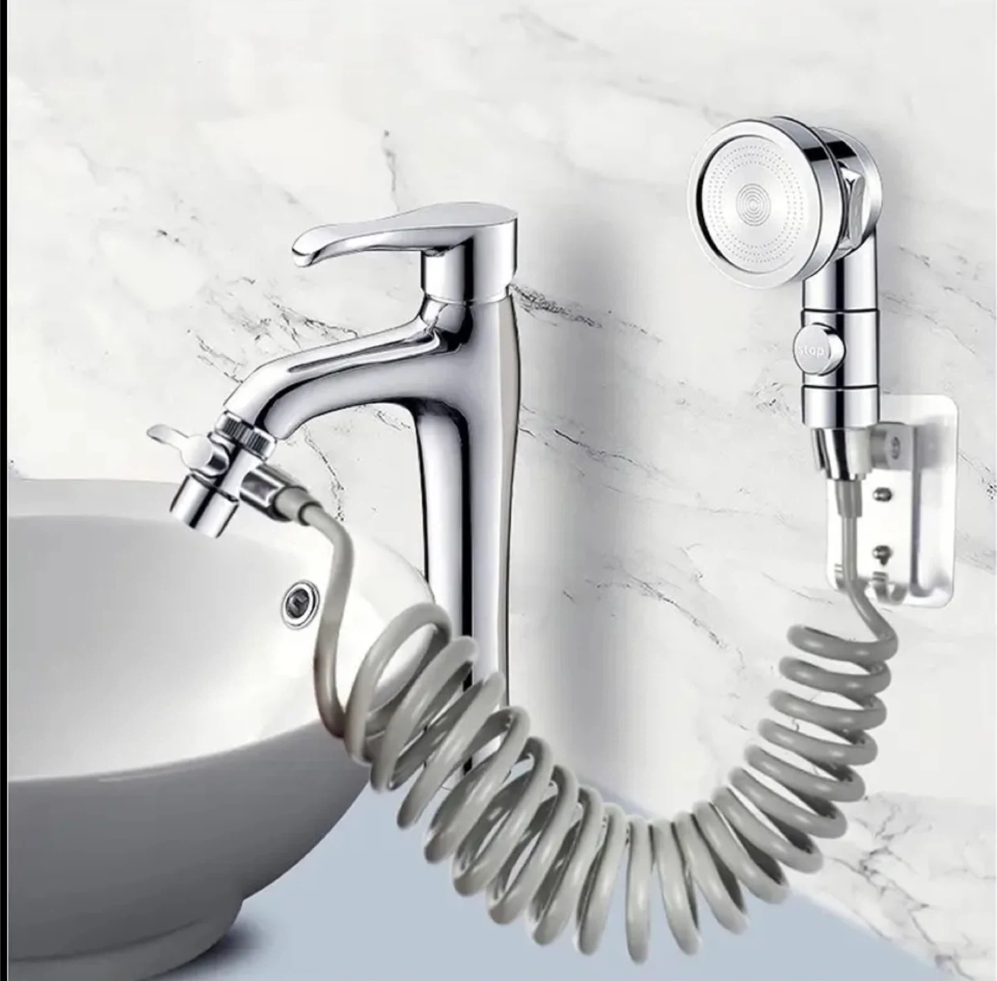 Can use the sink faucet + the shower head at the same time with the attachment included in the set!