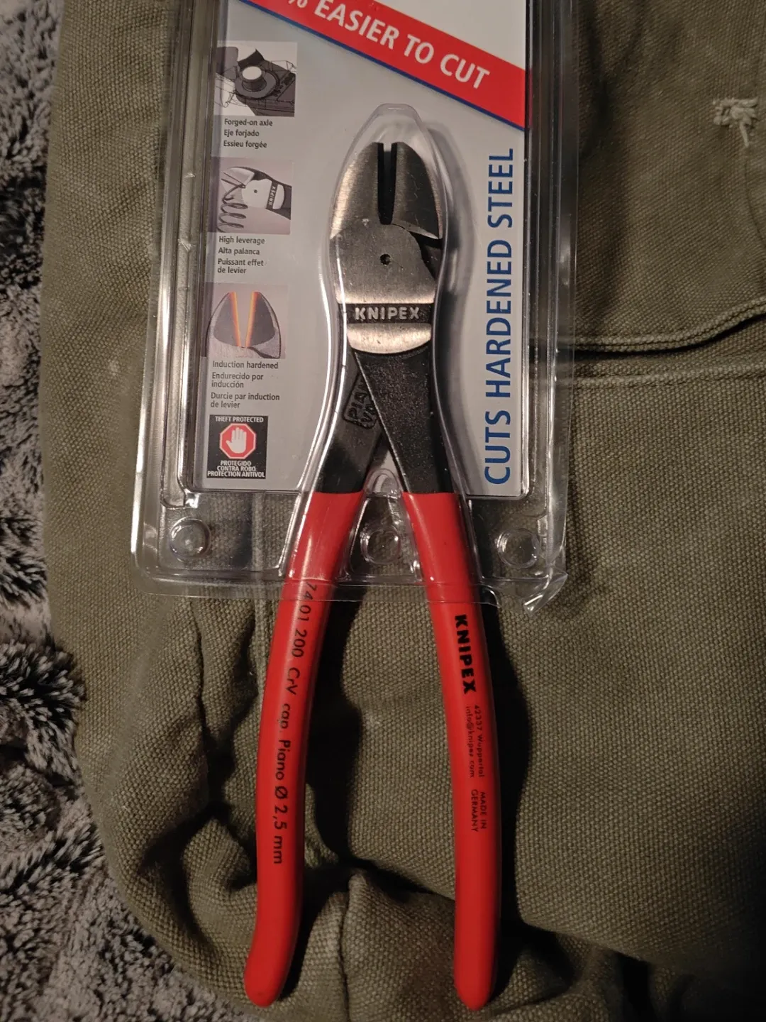 Knipex 74 01 200 diagonal cutters, 200mm length. Made with induction hardened C70 steel and features high leverage for easier cutting of hardened steel. Forged-on axle.