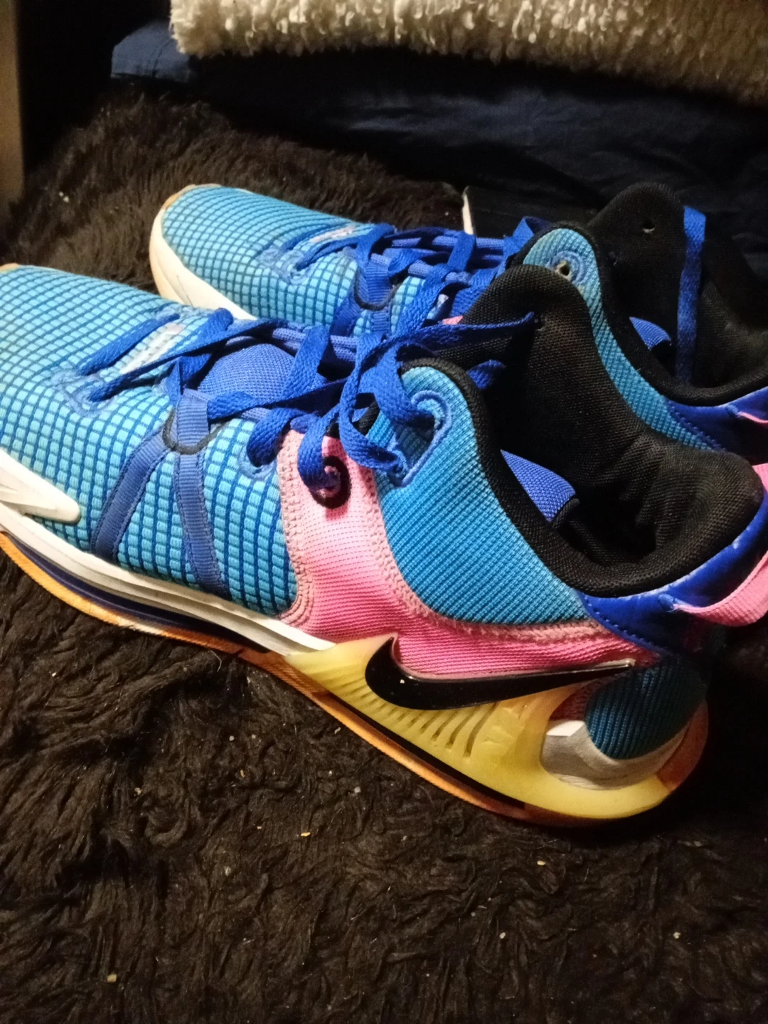 These Nike LeBron Witness 5 basketball shoes come in a vibrant blue, pink, and yellow colourway. They feature a durable mesh upper and a supportive heel counter. The shoe's design aims to provide stability and comfort on the court. Size 13