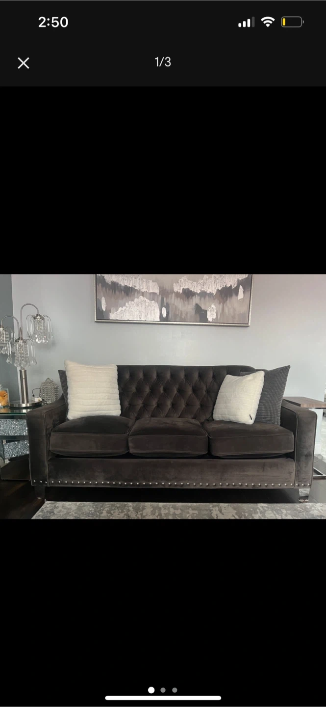 Dark grey velvet tufted chesterfield two sofas and one loveseat, It features silver nailhead trim detail along the base and arms.