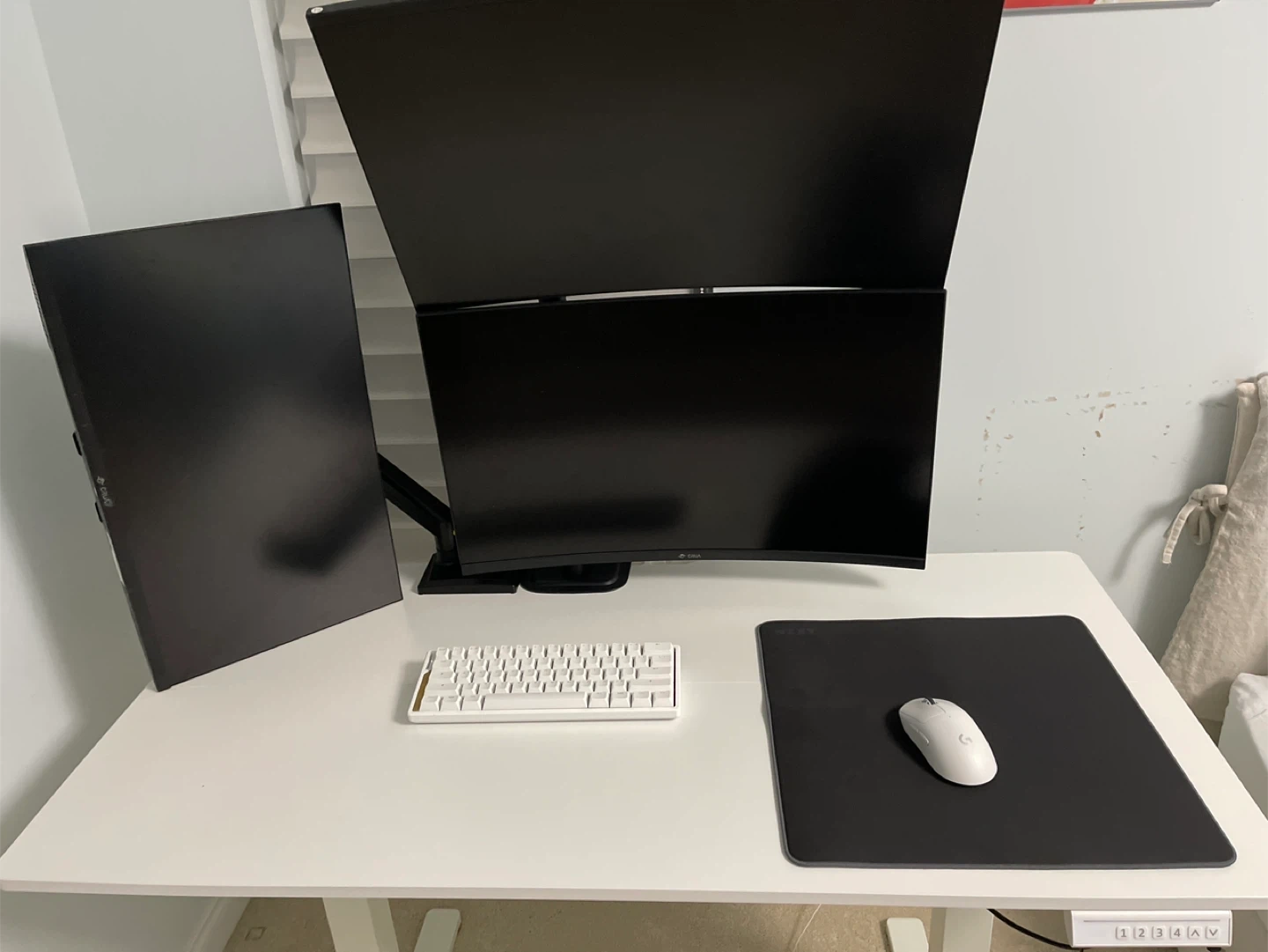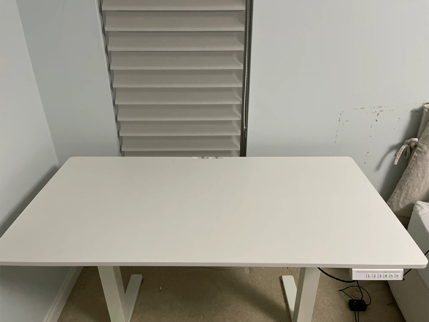White adjustable standing desk with electronic height controls. This desk's surface is smooth and spacious, perfect for a home office setup. Its electronic controls allow for easy height adjustments throughout the day. It's a functional piece for anyone looking to improve their workspace ergonomics.