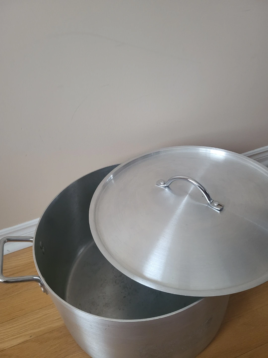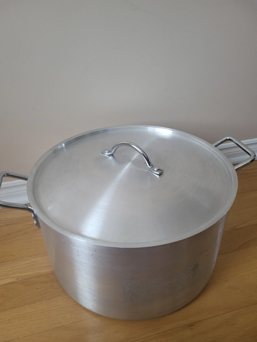 Large aluminum stock pot with a matching lid. It's great for making large batches of soup, stew, or stock. Aluminum material.
