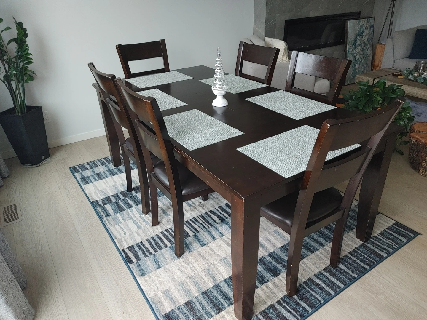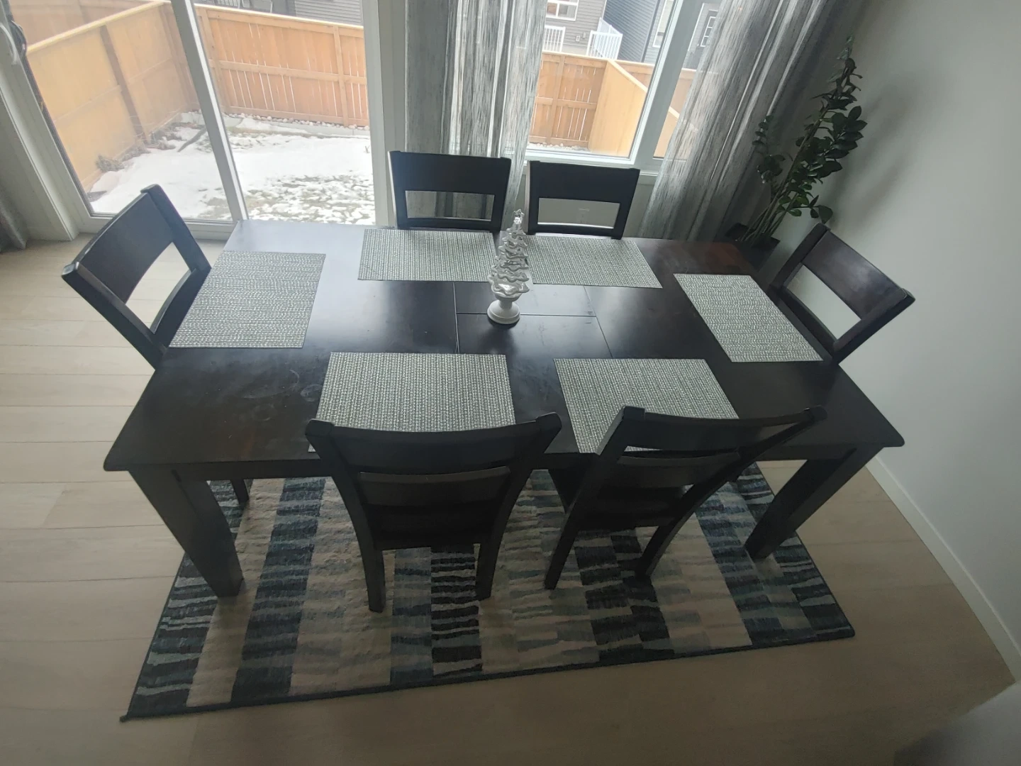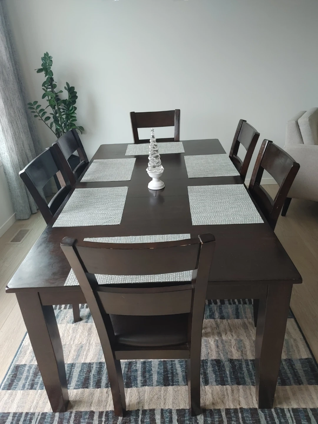 A dark wood very sturdy, adjustable dining table set with six matching chairs. The table has a rectangular top and the chairs have slat backs. Includes placemats. Located in NW. This table is very heavy and need your own transportation with 2-3 persons. Needs to disassemble before transport. I can assist with disassembly if needed.