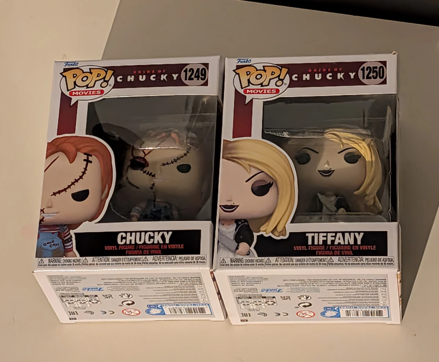 Selling a talking and moving Chucky doll plus Tiffany doll, both in great condition and ready to haunt your living room like they pay rent. On top of that, you get brand-new, unopened Chucky and Tiffany Funko Pops. Boxes untouched. Minty. No funny business.