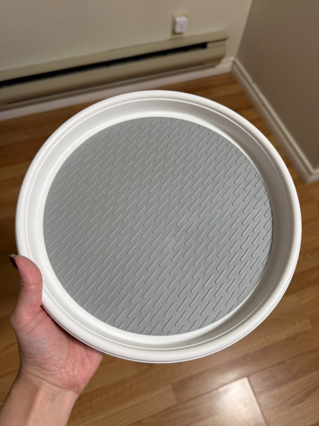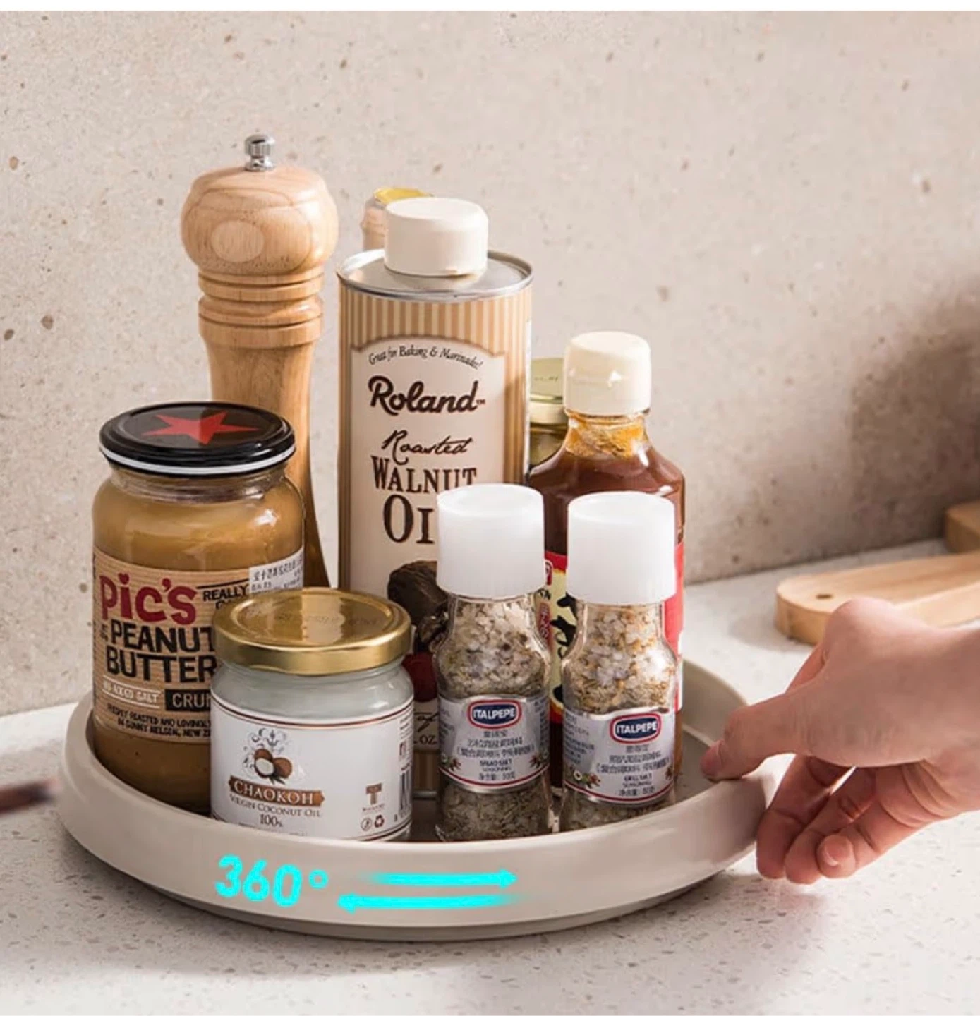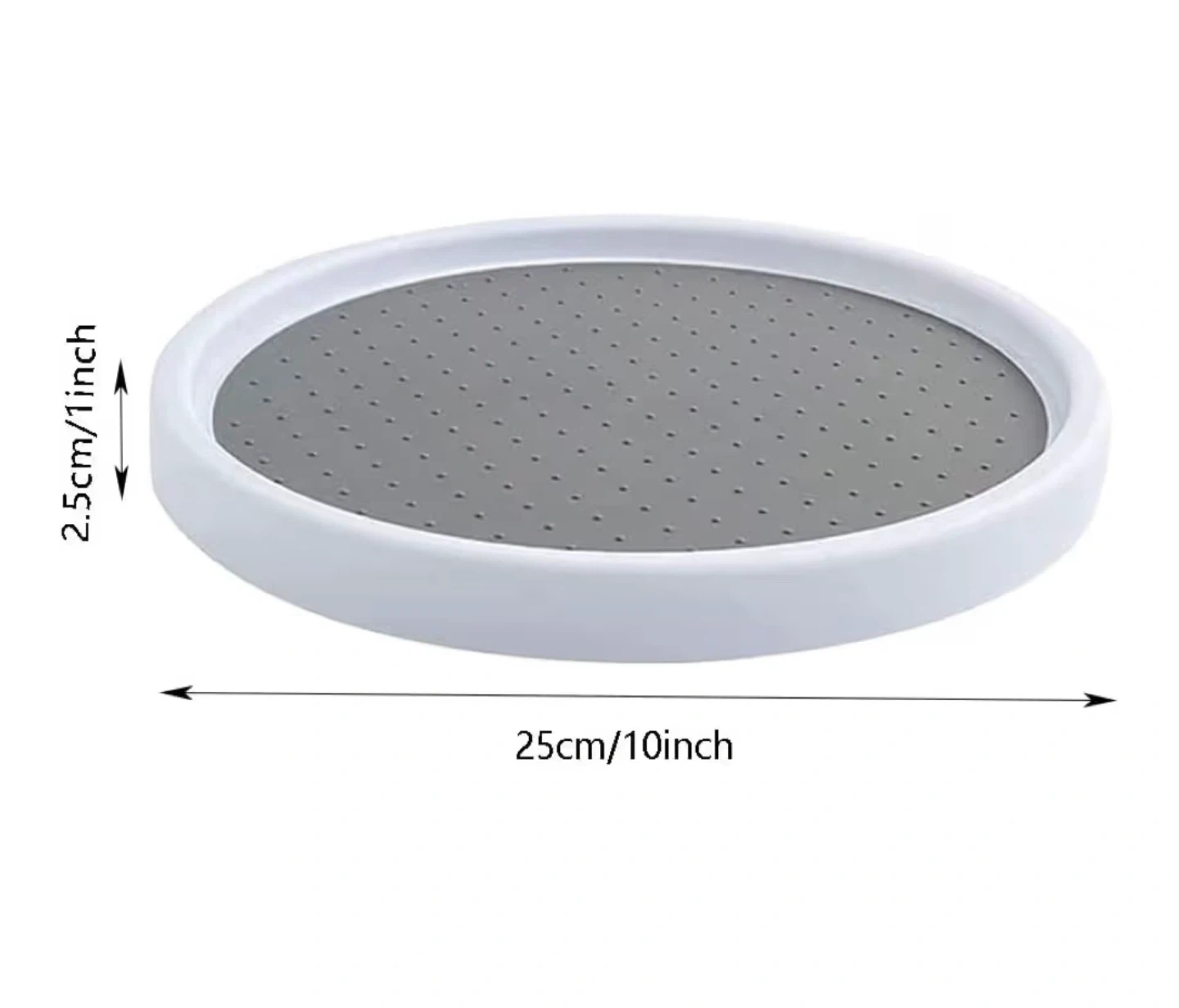 This 10-inch lazy Susan turntable is great for organizing your kitchen or pantry. It spins 360 degrees, making items easily accessible. Plastic and rubber material construction.