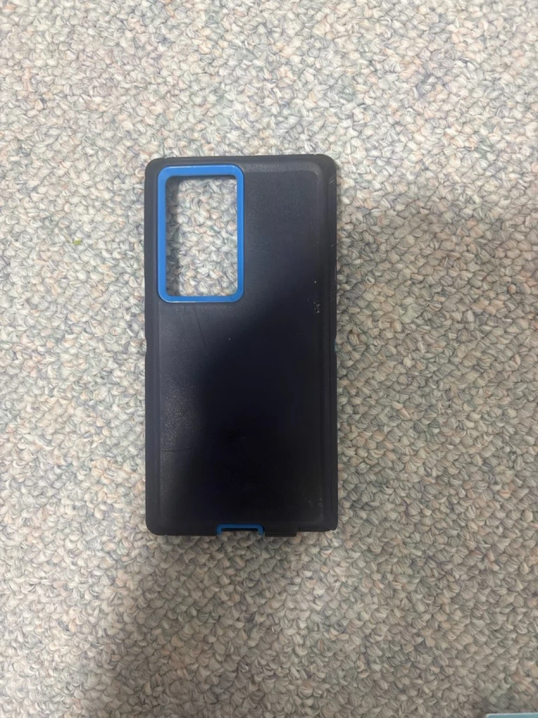 This is a dark blue OtterBox phone case with a blue accent around the camera opening. It's designed for durable protection. The case offers a secure grip and easy access to buttons and ports. Pick up cash only