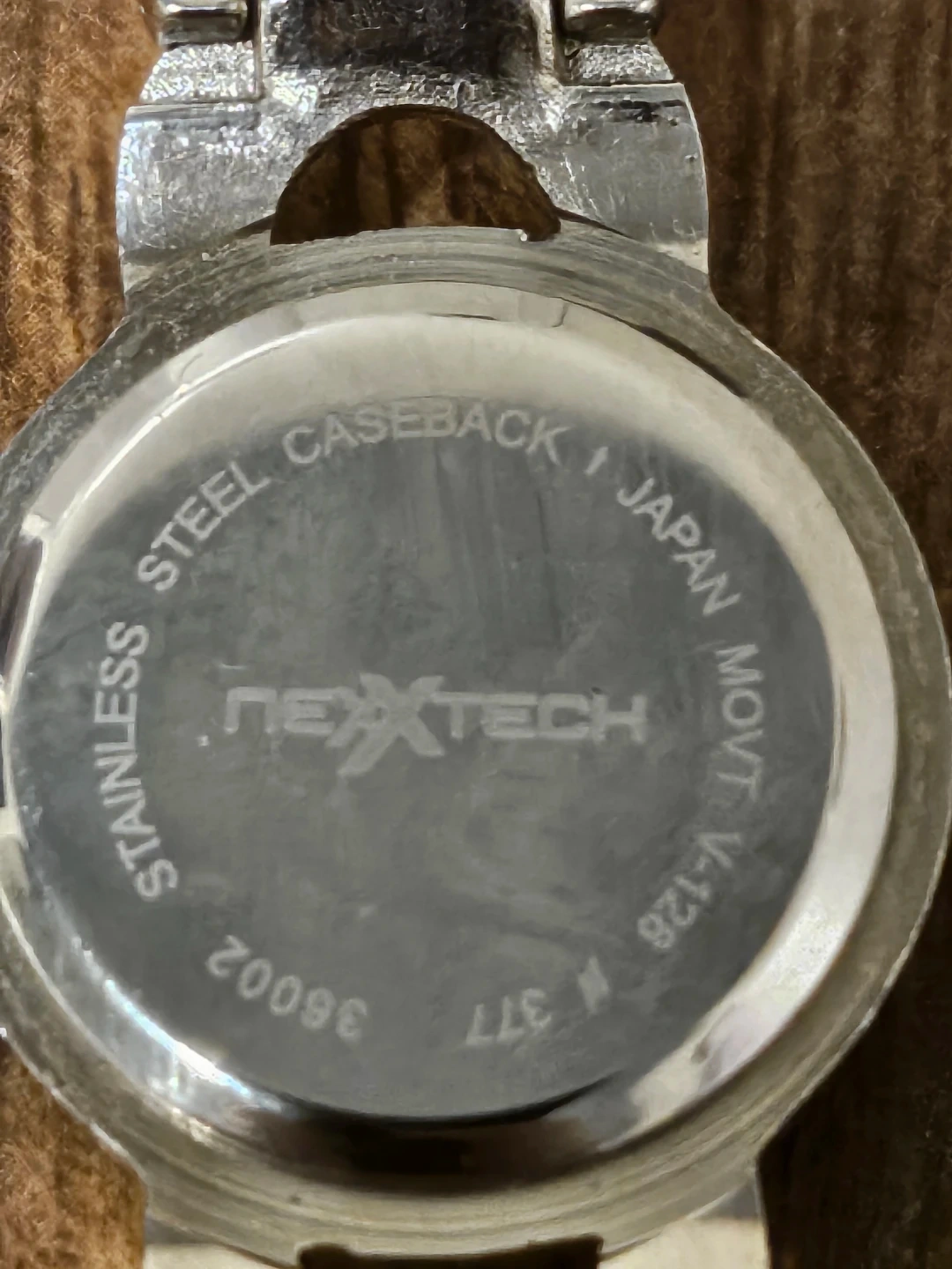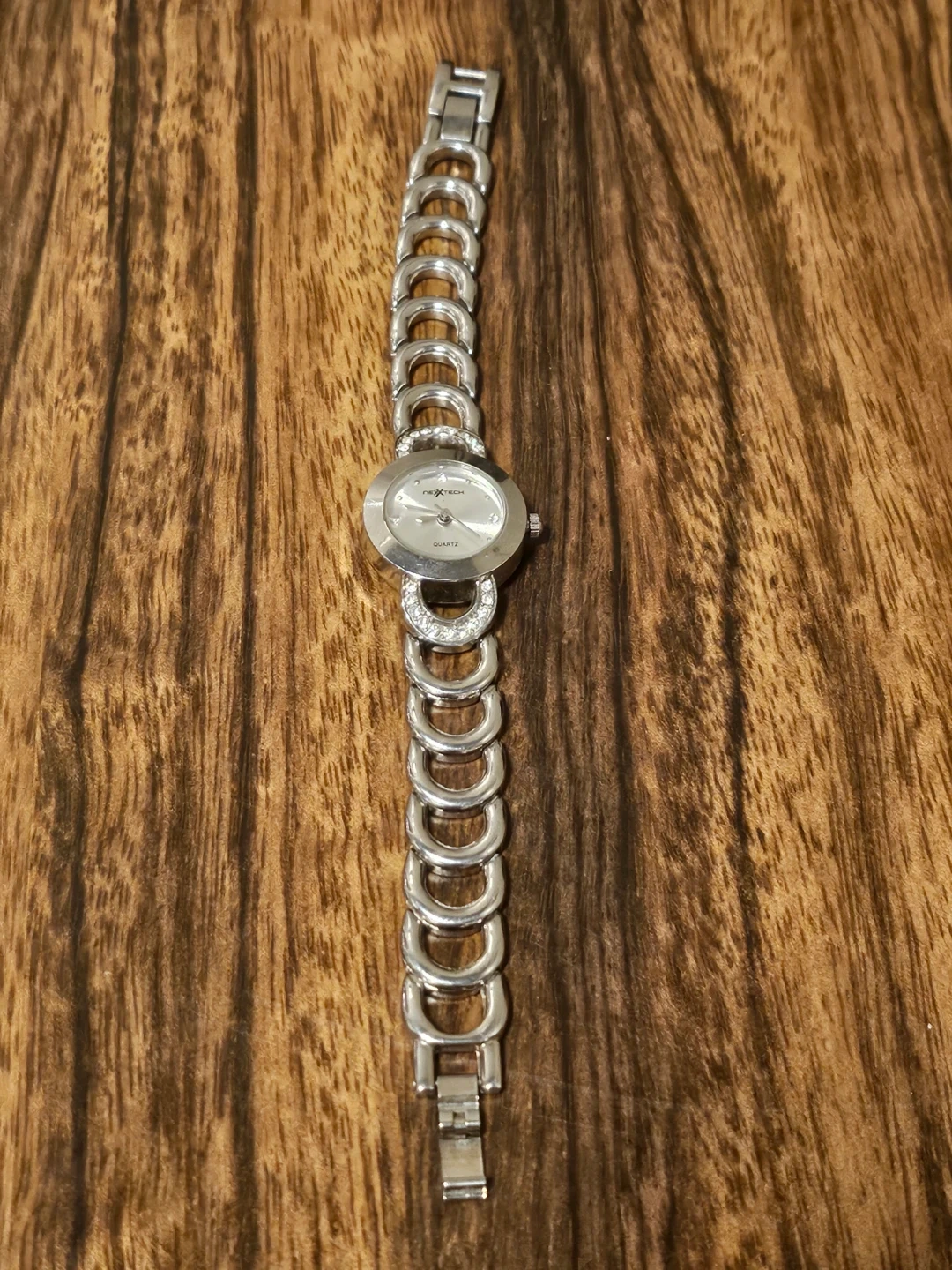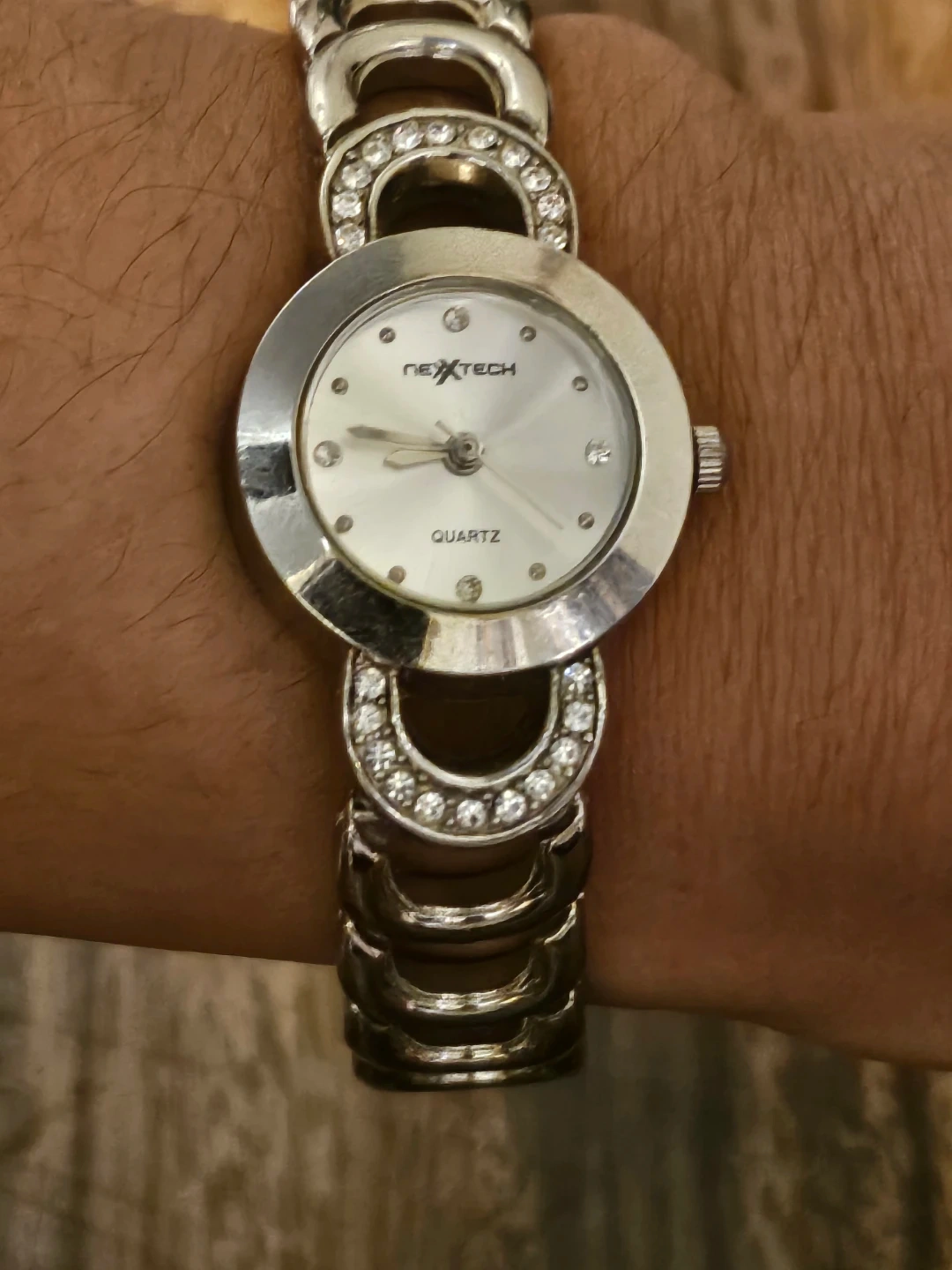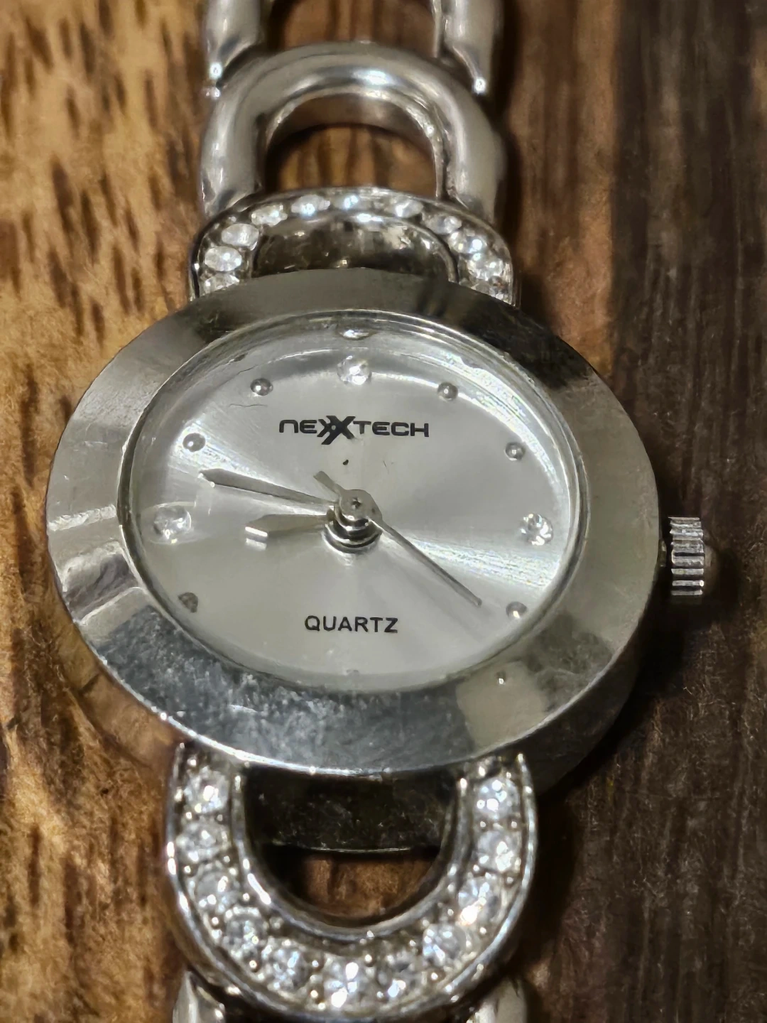 Nextech ladies quartz watch with a silver-tone metal band adorned with small rhinestones. It features a round, silver-coloured face with a crystal accent at each hour marker. The caseback is stainless steel with Japan movt.