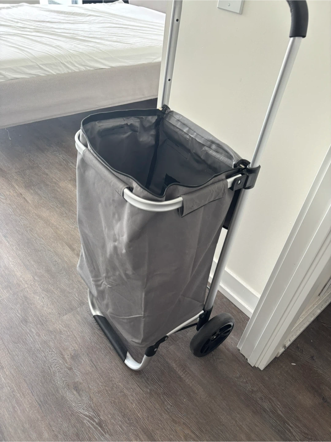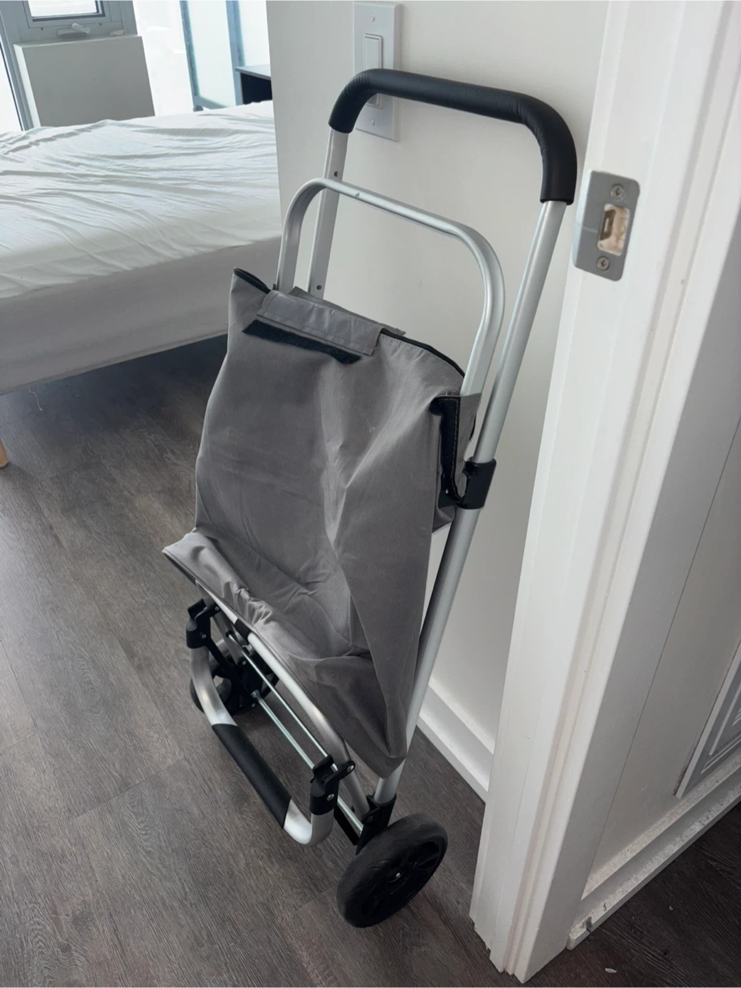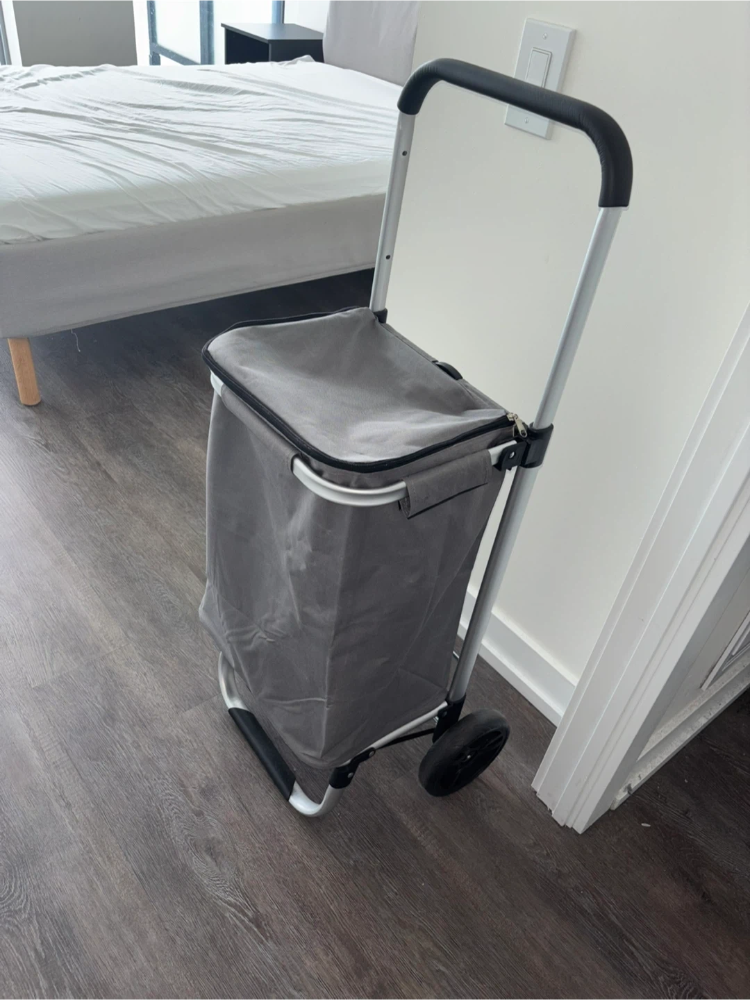 grey rolling shopping cart handy for groceries or errands. It has a durable fabric bag and a sturdy metal frame with wheels. Folds flat for easy storage. Cash only.