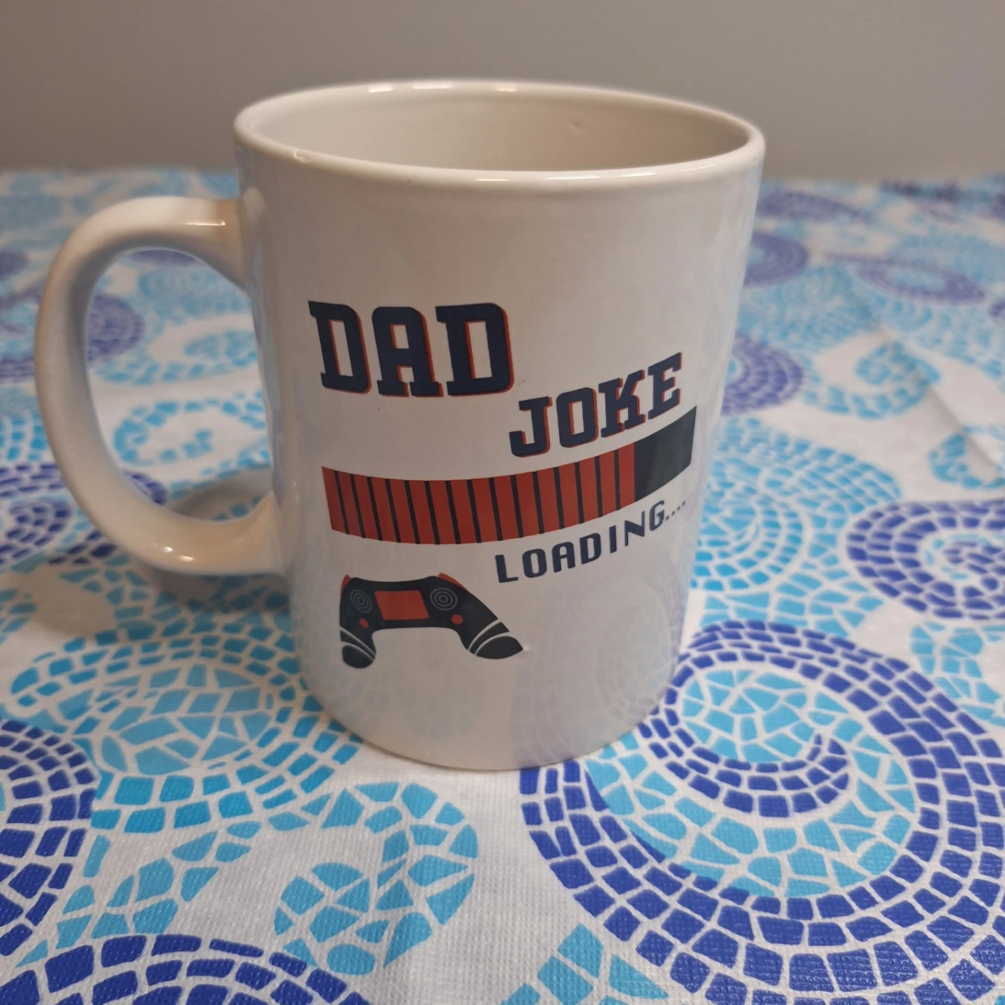 This white ceramic mug has 'DAD JOKE LOADING...' printed on it with a controller graphic. It's perfect for dads who love to share their jokes! Standard mug size.