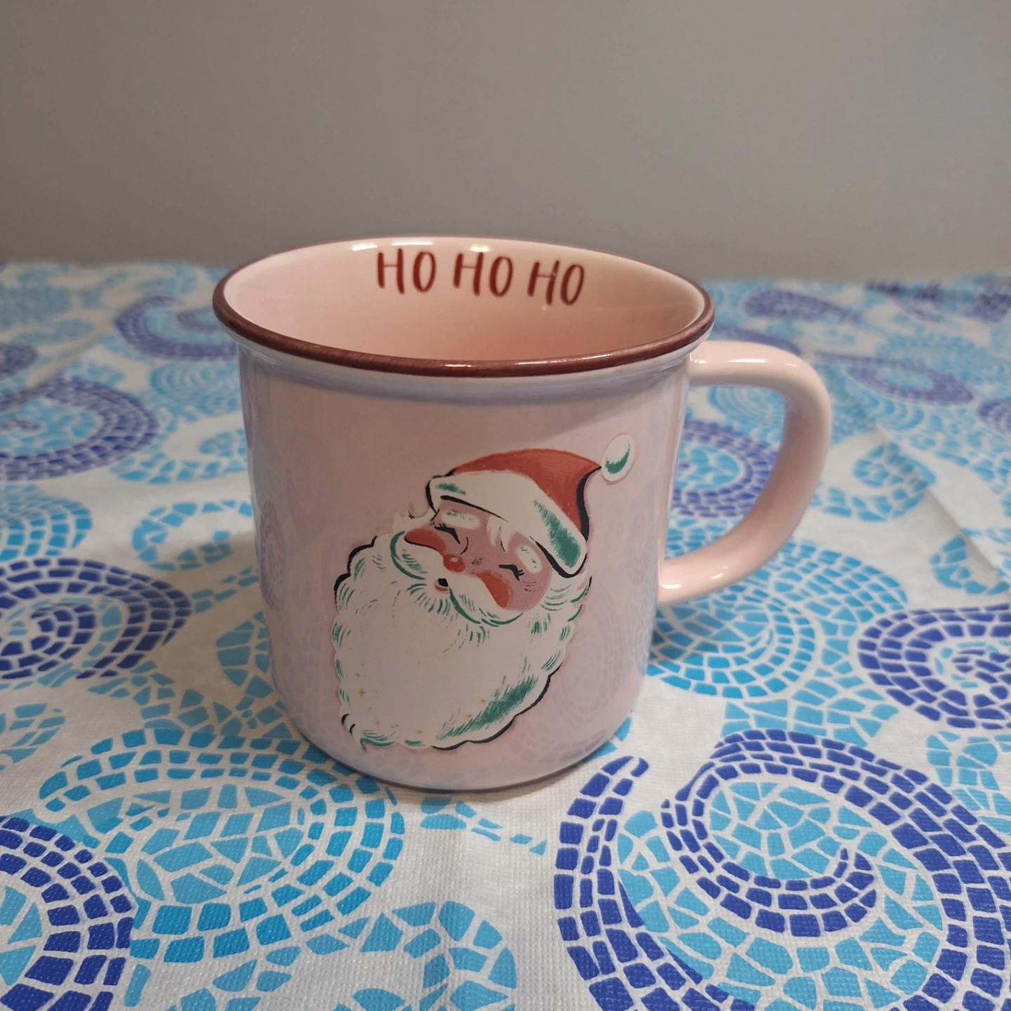 This light pink mug features a cheerful Santa Claus graphic and "HO HO HO" text. It's perfect for enjoying your favourite holiday beverages! Made of ceramic.