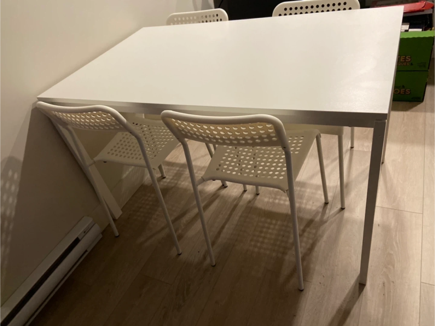 This is a white IKEA dining table with four matching chairs. The table has a metal frame and a smooth white top. The chairs are also white with a perforated seat and back. It's a simple, modern set for any dining area.
