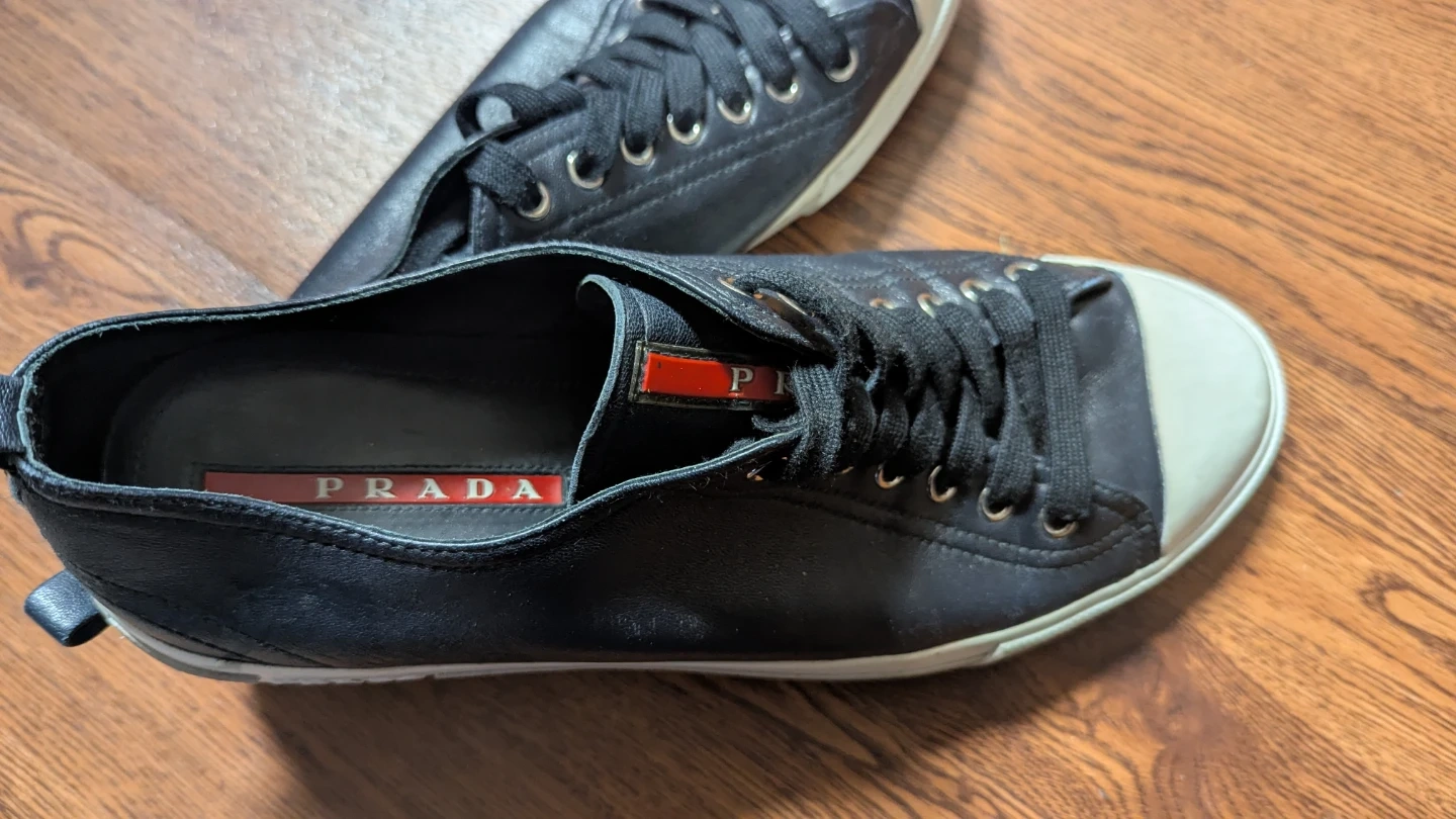 These are Prada black leather sneakers with white soles. They feature laces and the iconic Prada logo detail. Great for everyday wear!